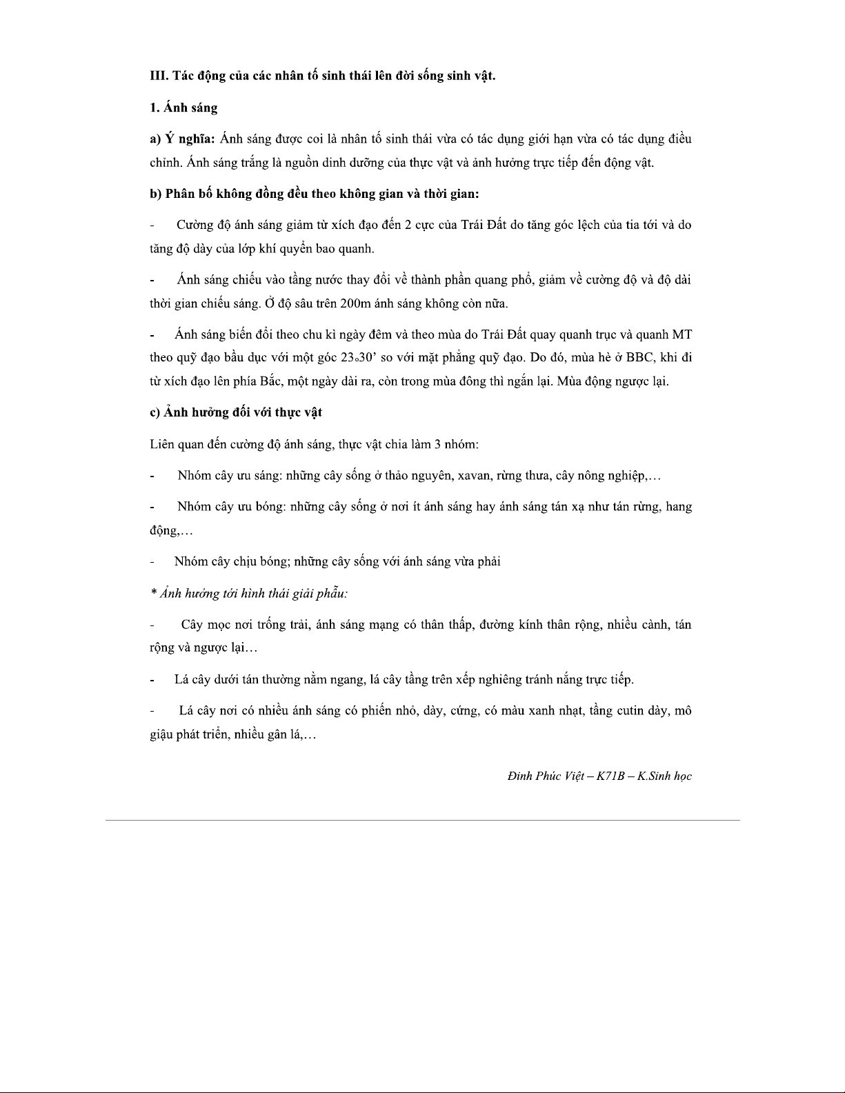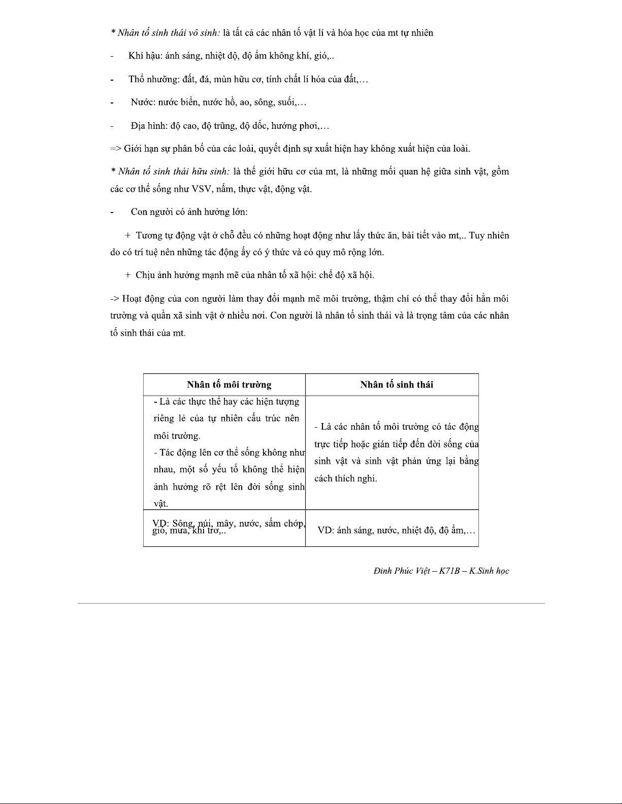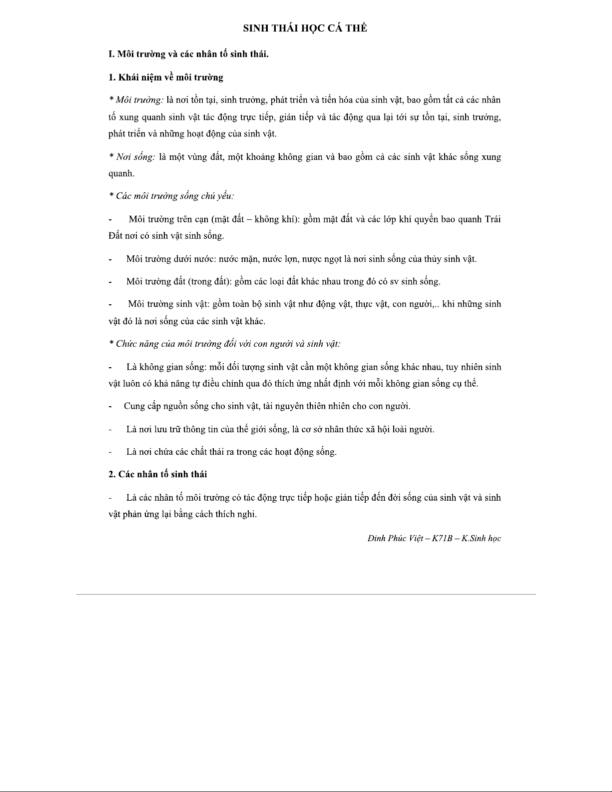 Đề cương Chi tiết về Nhân tố Sinh thái Học - Môn SINH THÁI HỌC
