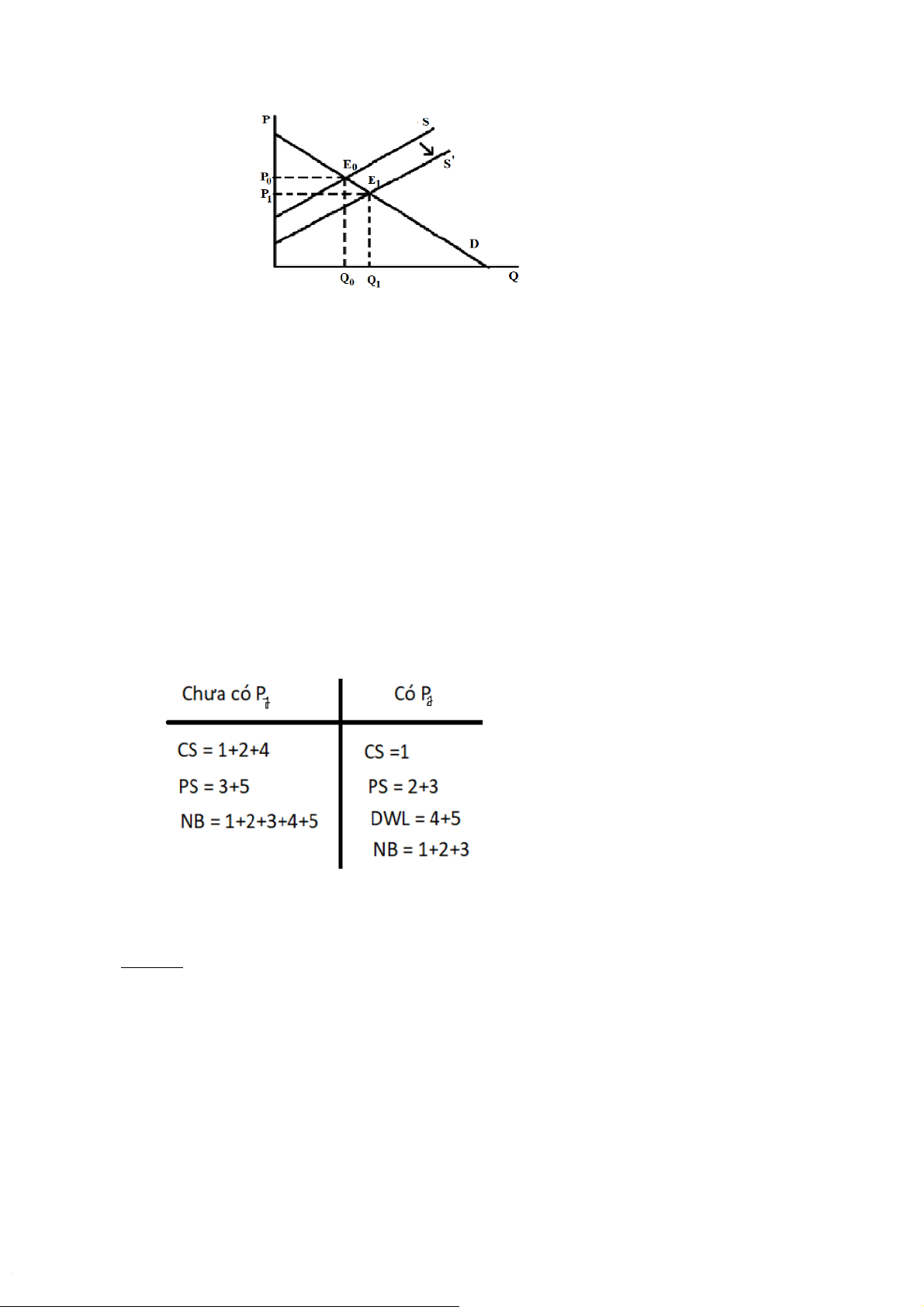⇒ Lợi ích NSX và NTD bị giảm xuống, NB giảm, gây ra DWL cho XH . Chưa có PC Có PC +) CS = 1+4 +) CS =1+2 +) PS = 2+3+5 +) PS =3 +) NB = 1+2+3+4+5 +) DWL = 4+5 +) NB =1+2+3