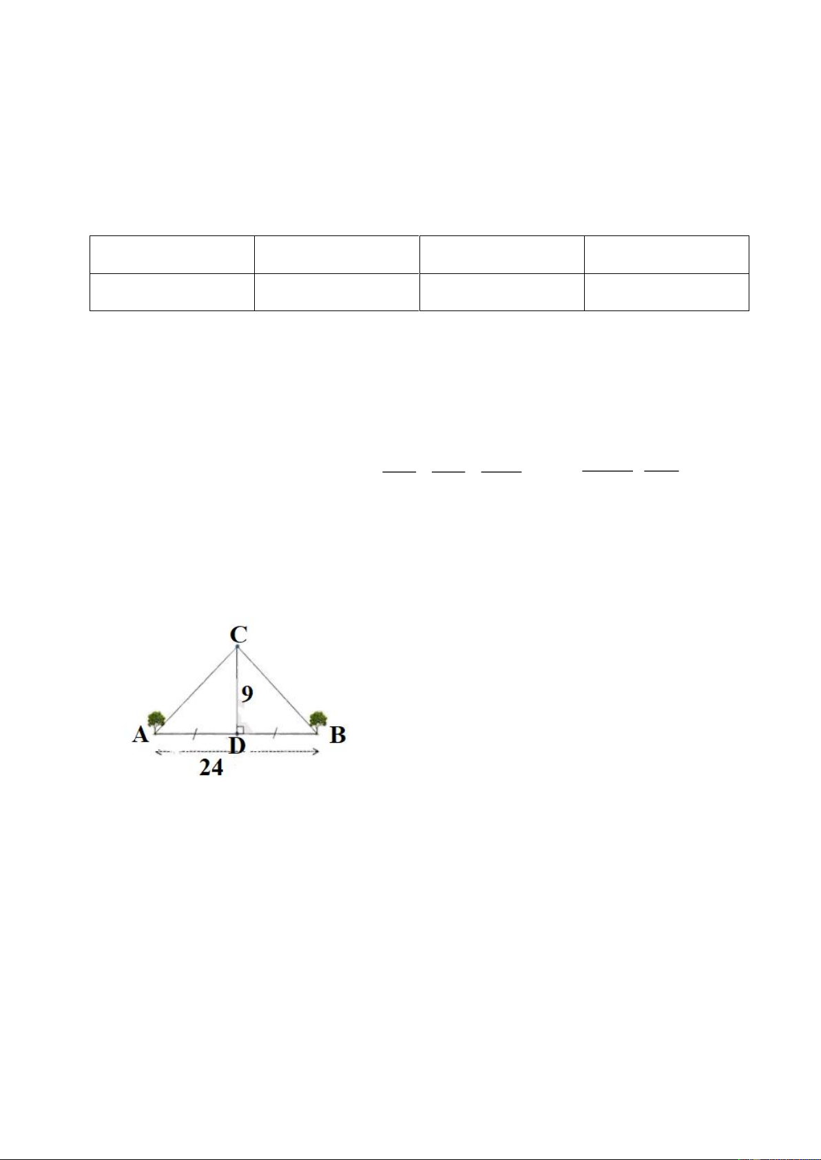 Hai cây A và B được trồng dọc trên đường, cách nhau 24m và cách đều cột đèn D. Ngôi