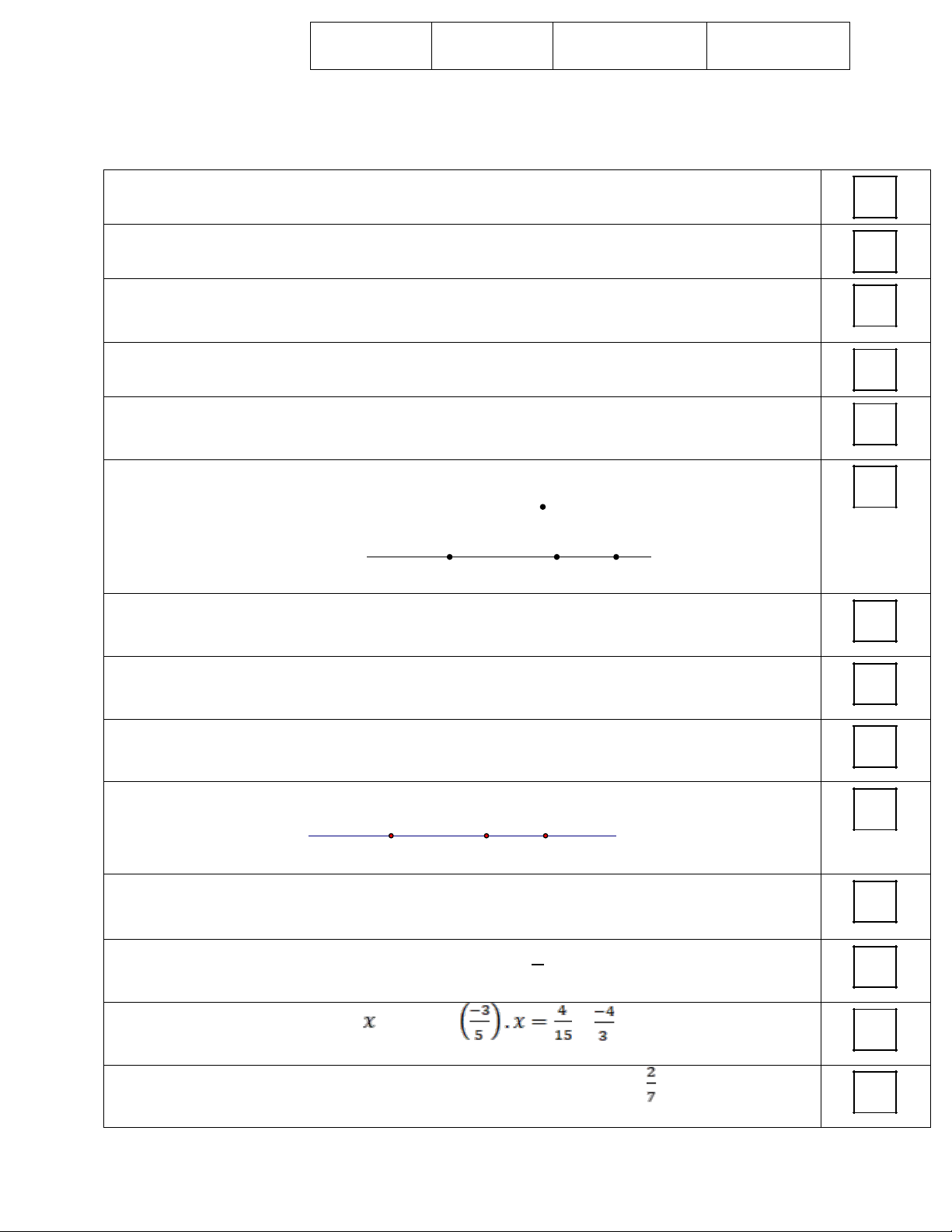 Câu 7. Số đối của 7 là: 3 A. 3 B. 1 2 C. 3 D. 7 7 3 2 3 1 Câu 8. Cho biết 4 x = . Số x thích hợp là : 5 − 10 A. x = -10 B. x = -8 C. x = 10 D. x = 8 −