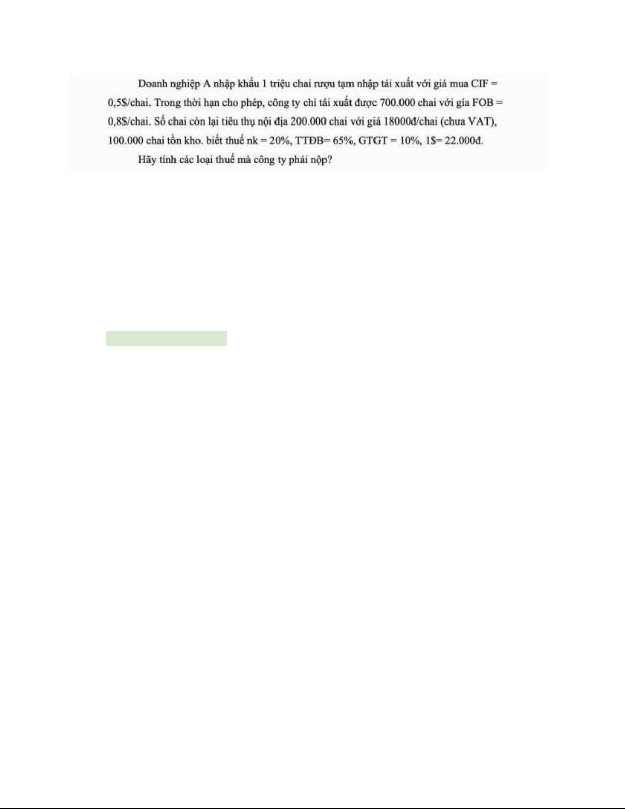 Thuế TTDB phải nộp = 150 triệu – 72 triệu = 78 triệu đồng lOMoAR cPSD| 59773091 Thuế xuất nhập khẩu: 0.5 $ = 11 000 vnd