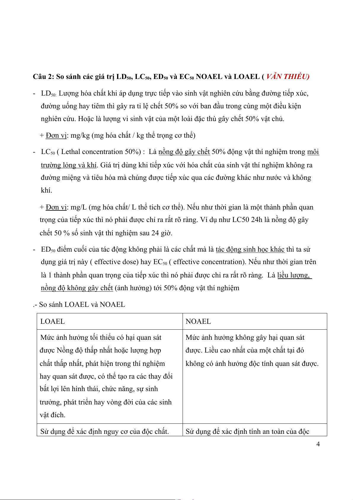 Câu 2: So sánh các giá trị LD , LC 50 , ED 50 và EC 50 NOAEL và LOAEL ( 50 VẪN THIẾU)