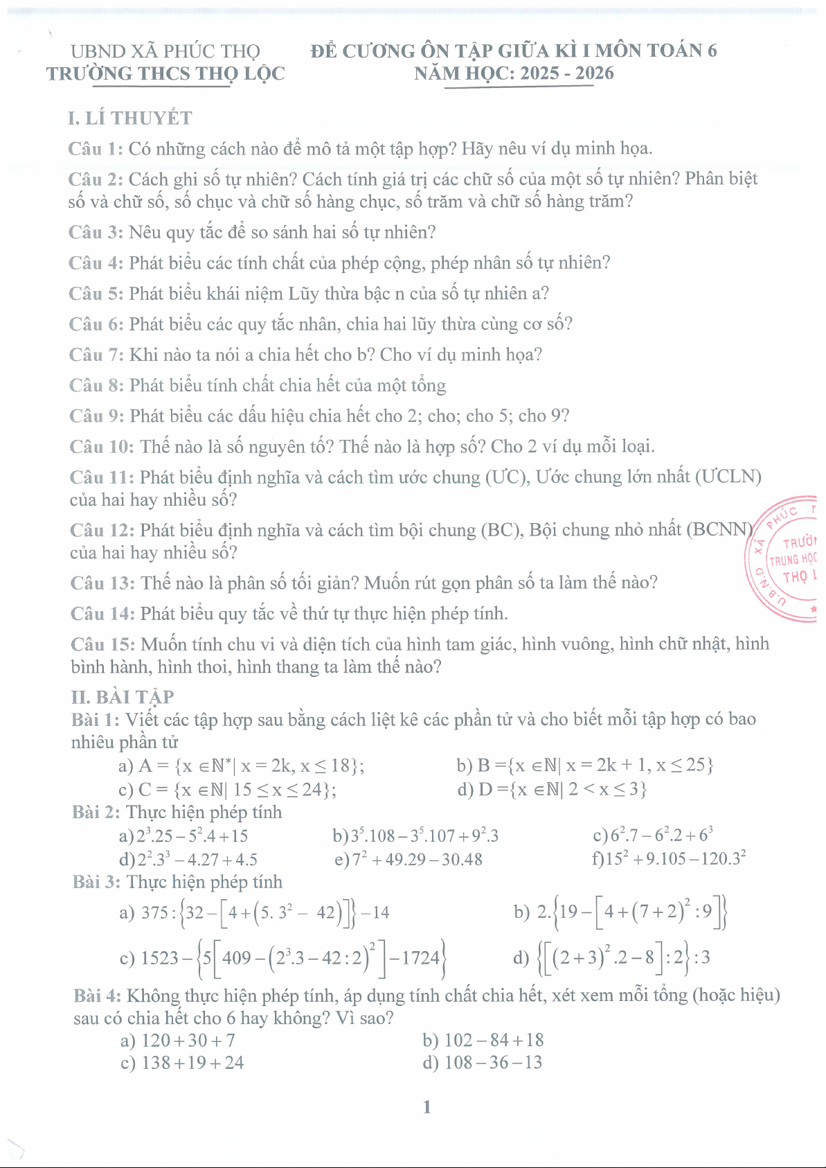 Xin giới thiệu đến quý thầy, cô giáo và các em học sinh đề cương ôn tập giữa học kì 1 môn Toán 6 năm học 2025 – 2026 trường THCS Thọ Lộc, xã Phúc Thọ, thành phố Hà Nội.