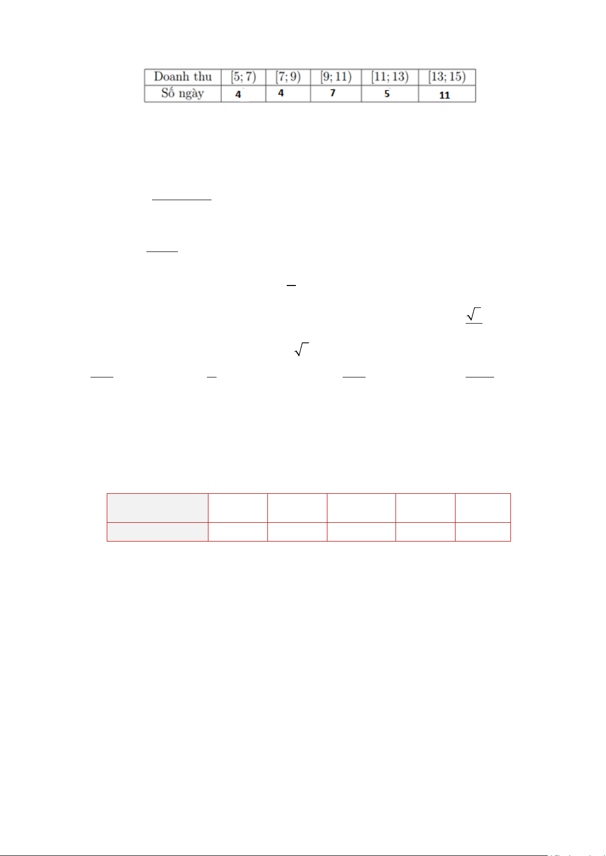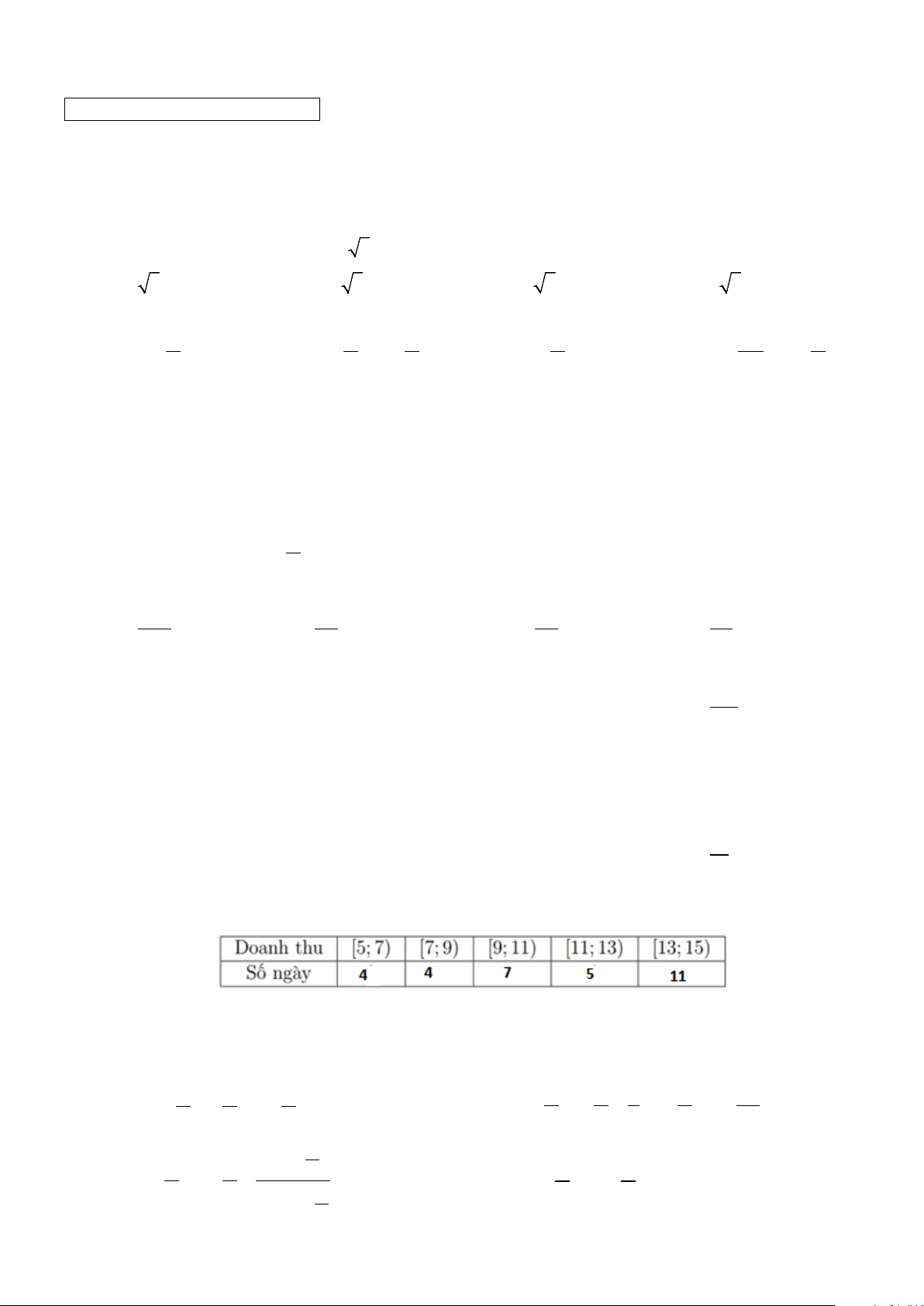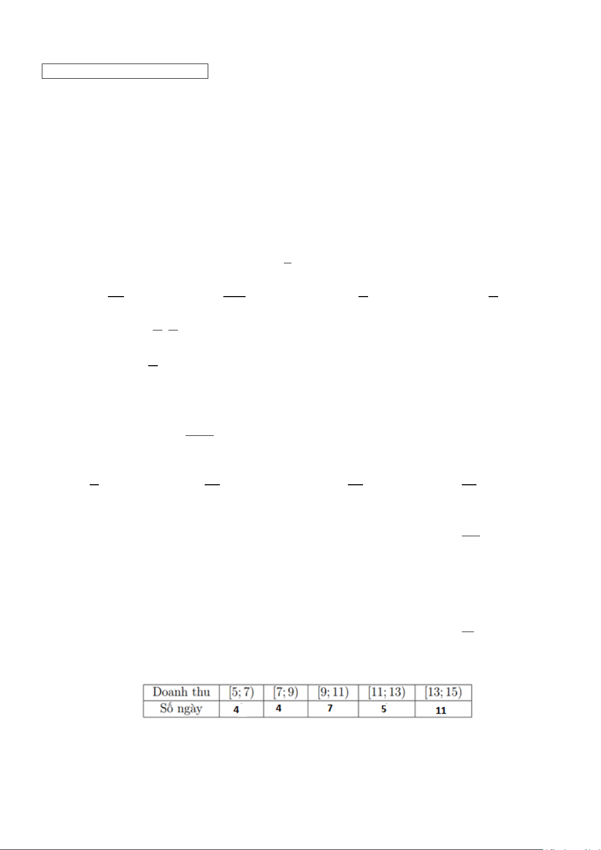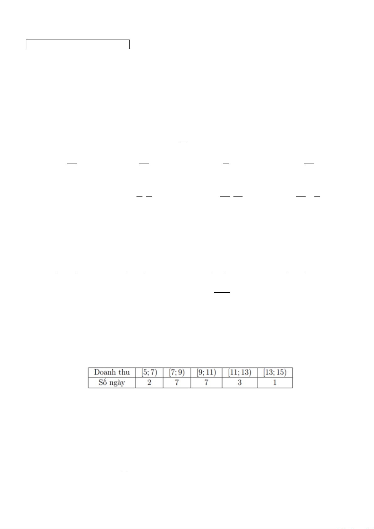 Câu 9. Doanh thu bán hàng trong 20 ngày được lựa chọn ngẫu nhiên của một của hàng được ghi