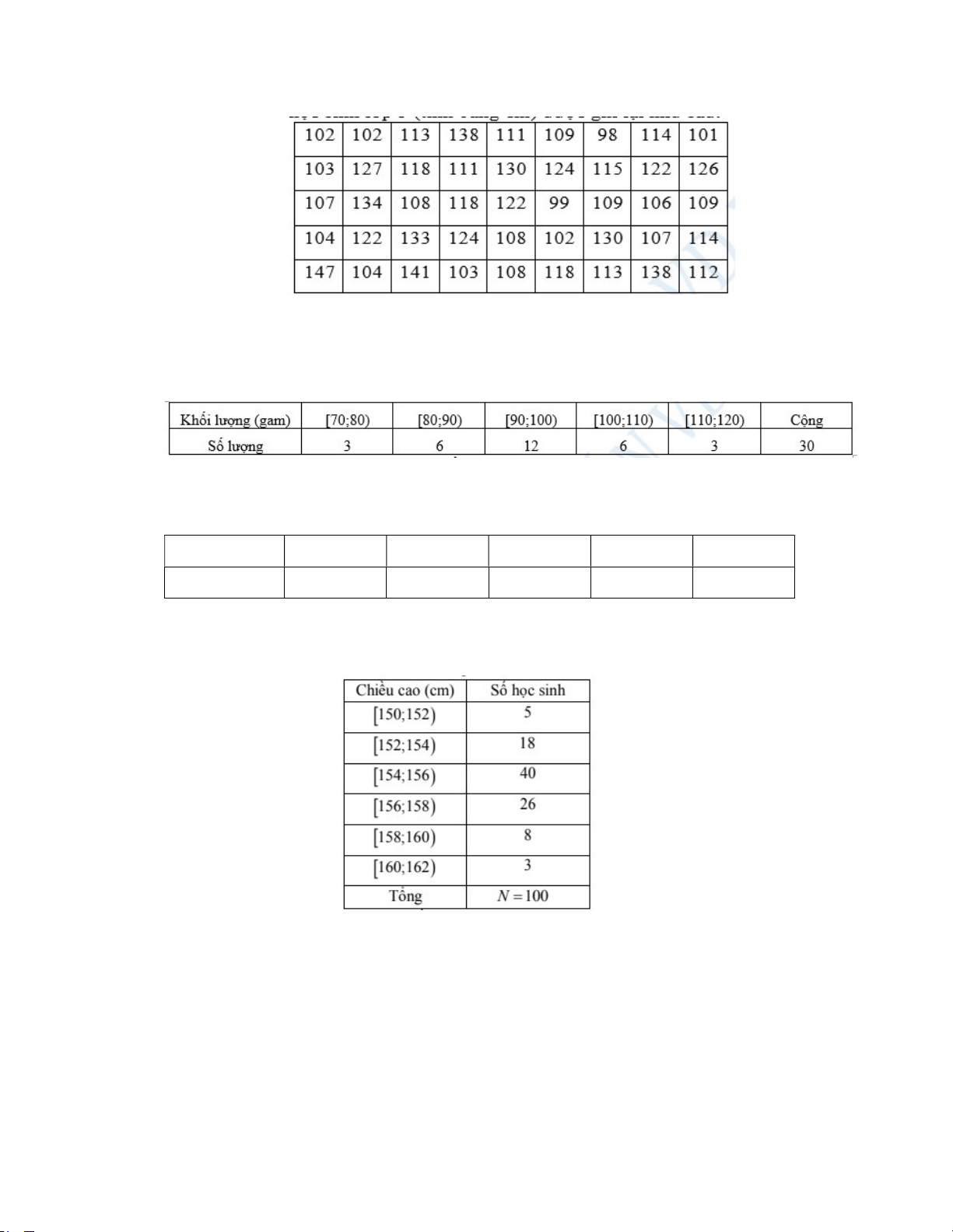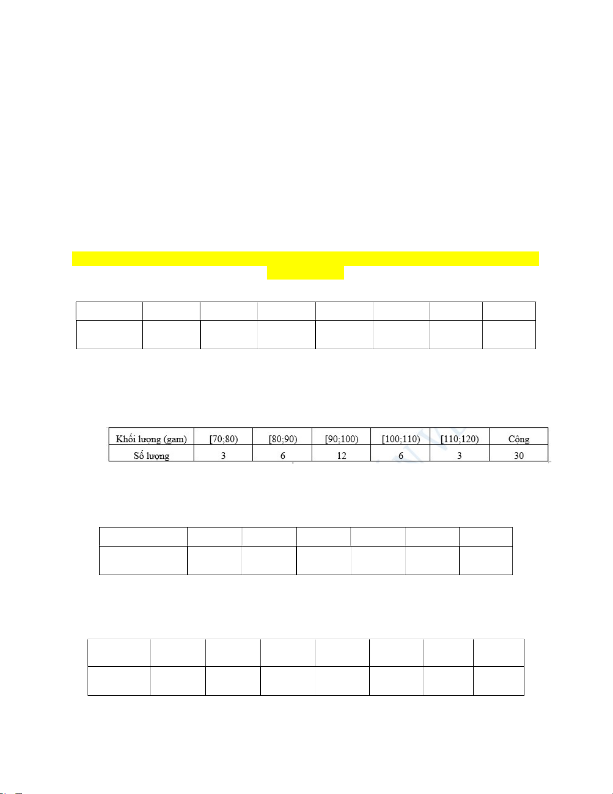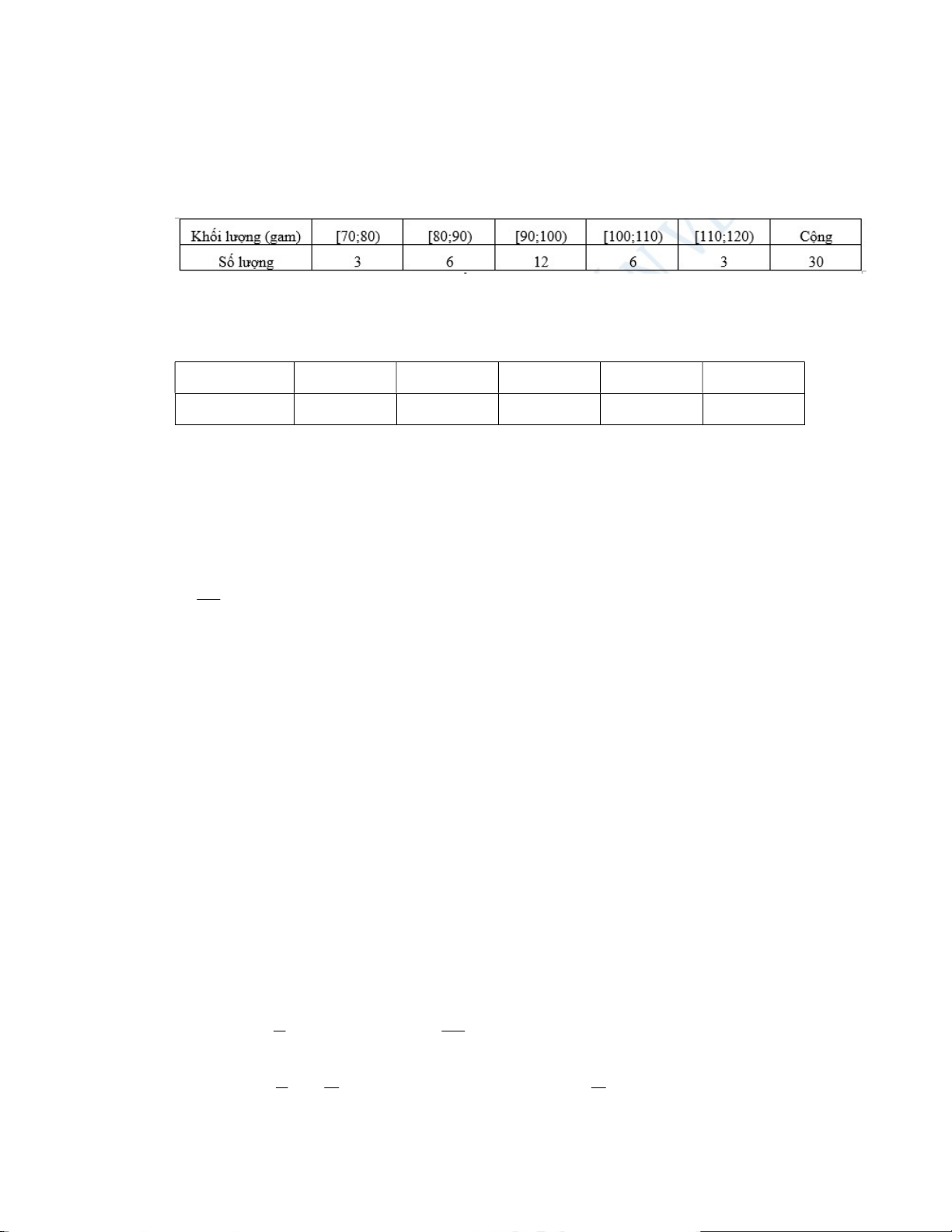 Câu 70: Cho bảng khảo sát về khối lượng của 30 củ khoai tây thu hoạch ở một nông trường như sau: