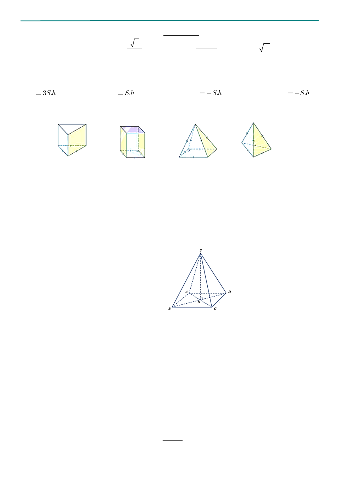 Câu 13. Hình chóp đều có chiều cao là h, diện tích đáy bằng S. Khi đó thể tích V của hình chóp đều đó bằng 1 1 A.V 3S.h B.V S.h C.V S.h D. V S.h 3 2