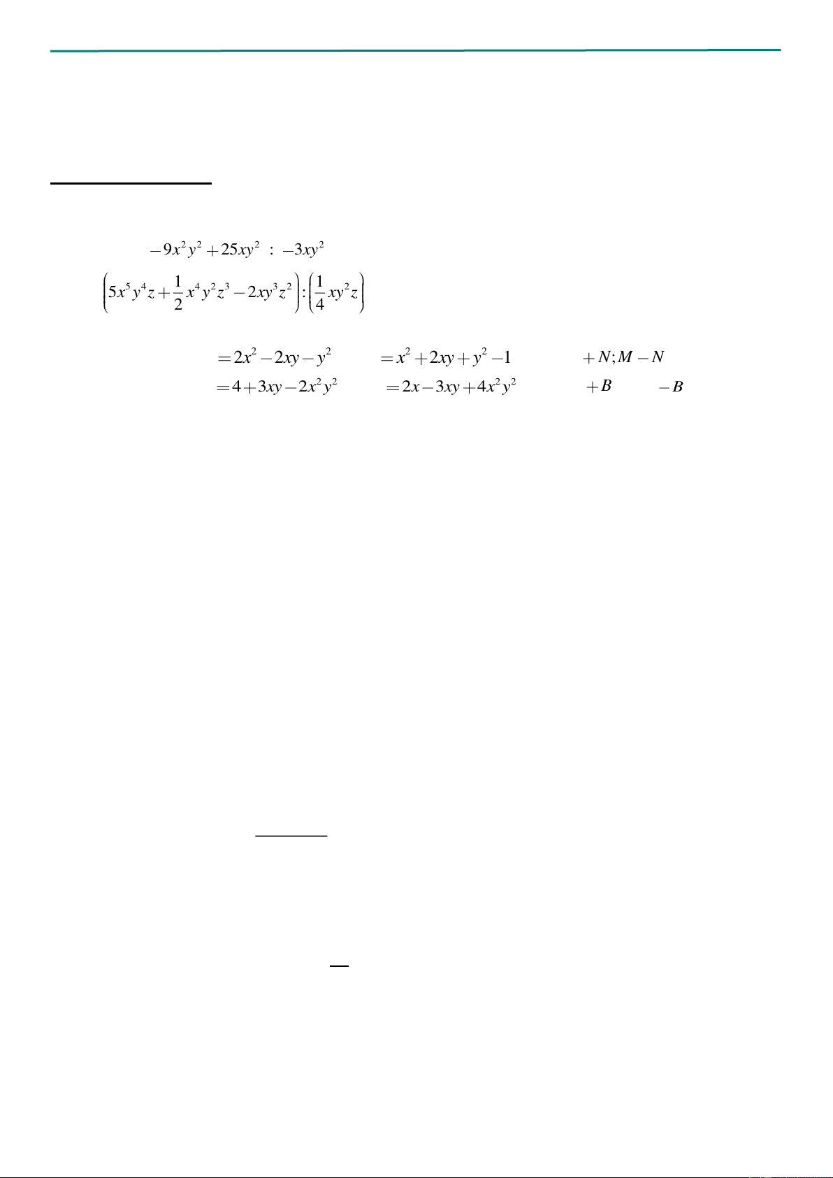 Câu 1. Thực hiện phép tính 1) 4 3 2 2 2 2 3x y 9x y 25xy : 3xy . 3) ( x − y) ( 2 3 7 . x + 2xy) 2) 1 1 5 4 4 2 3 3 2 2 5x y z x y z 2xy z : xy z . 4)