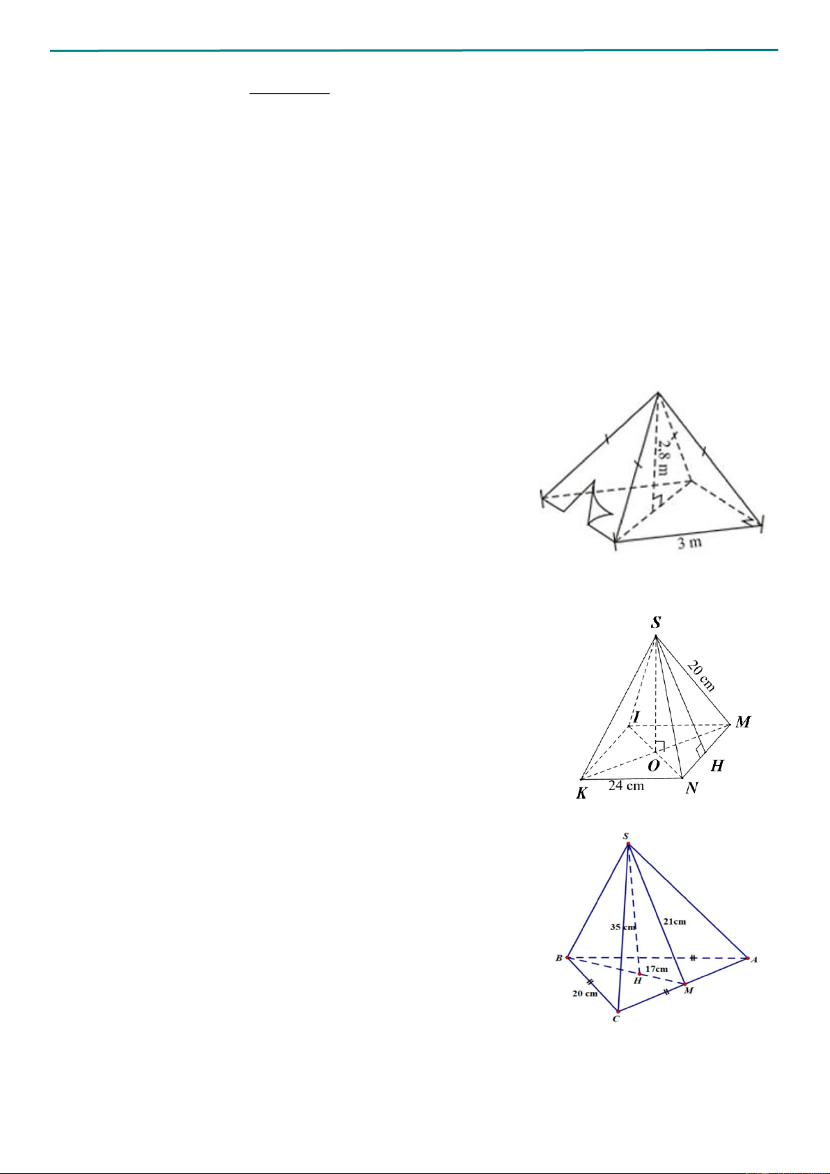 Câu 1. Cho hình chóp tam giác đều S.ABC có độ dài cạnh đáy là 12 cm, độ dài cạnh bên là 8 cm. Hãy tính: