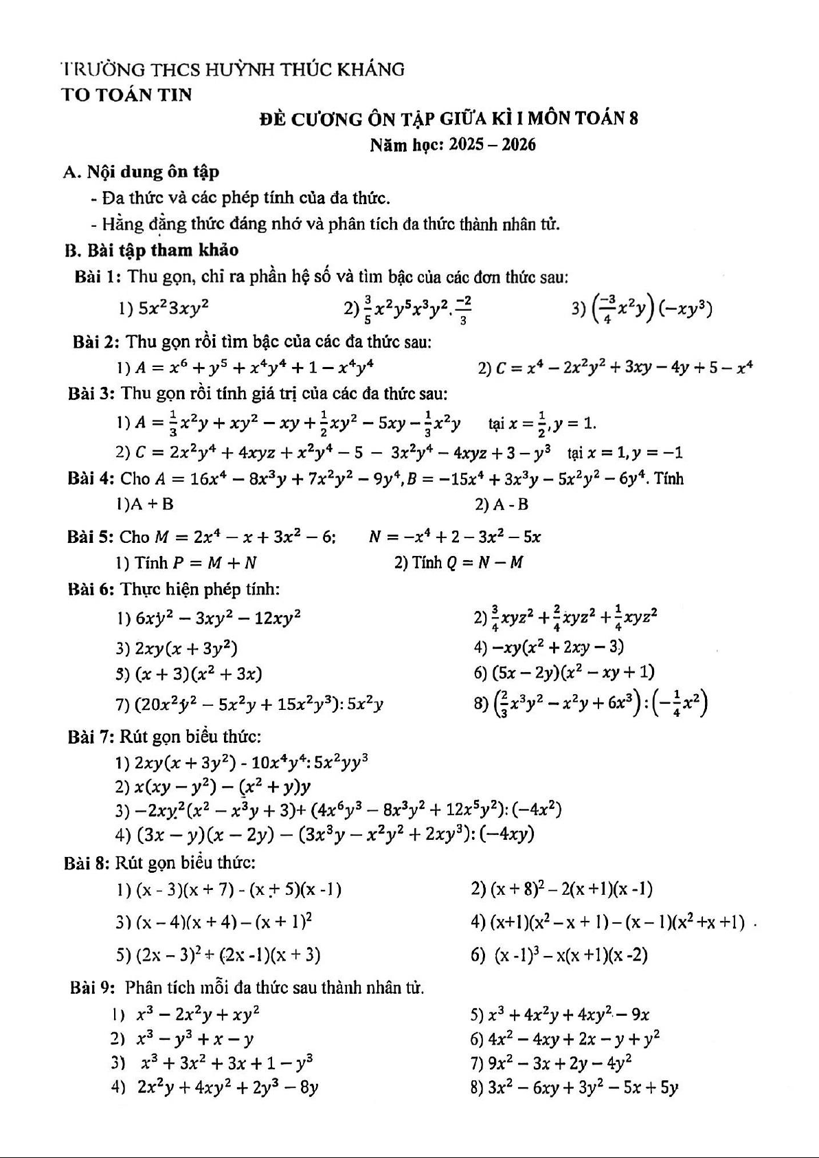 Xin giới thiệu đến quý thầy, cô giáo và các em học sinh đề cương ôn tập giữa học kì 1 môn Toán 8 năm học 2025 – 2026 trường THCS Huỳnh Thúc Kháng, thành phố Đà Nẵng.