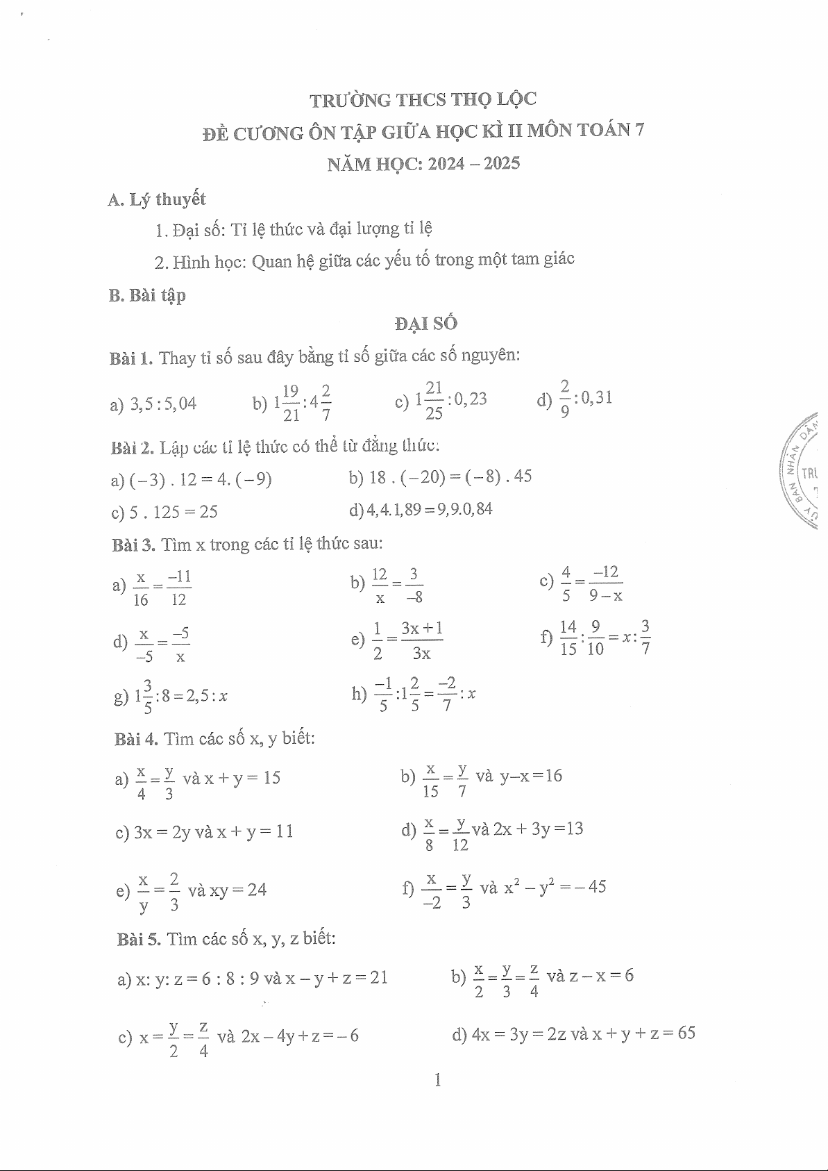 Đề cương giữa kì 2 Toán 7 năm 2024 – 2025 trường THCS Thọ Lộc – Hà Nội