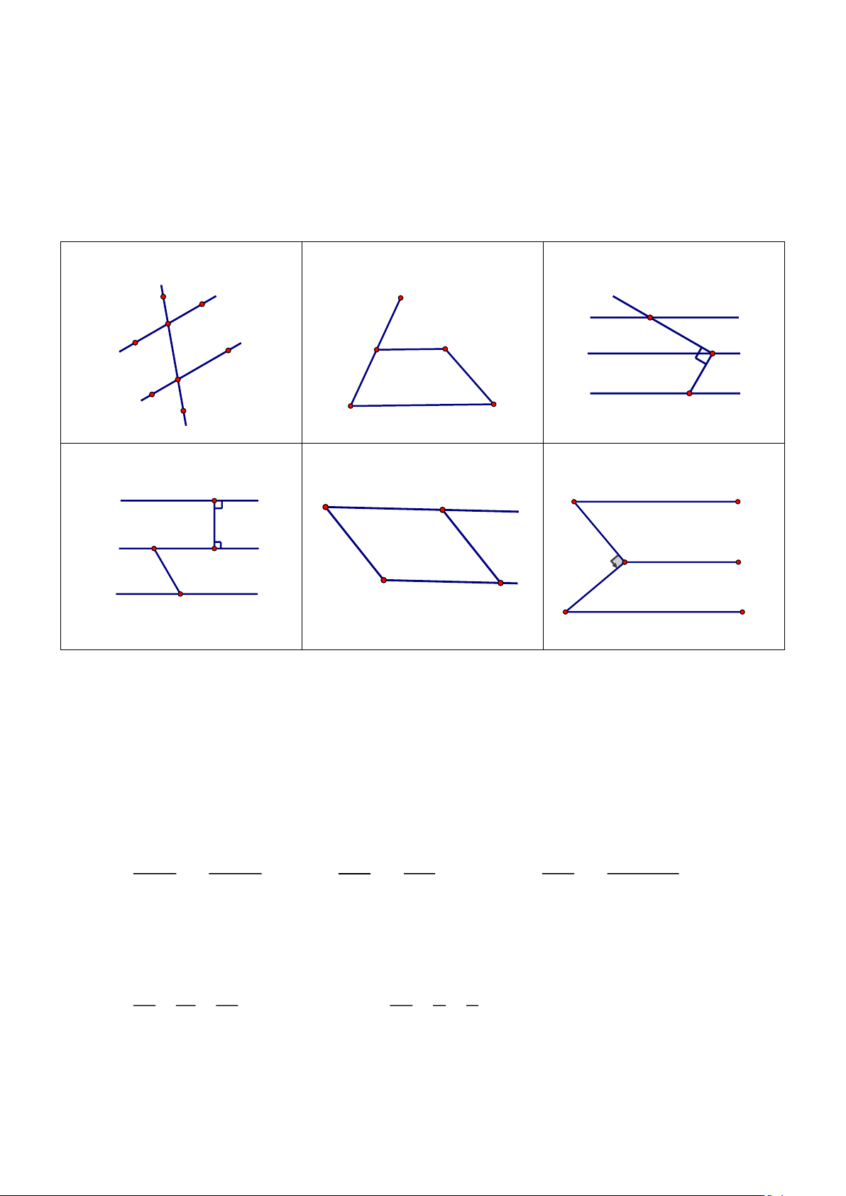 Bài 11. Quan sát các hình vẽ, tìm các cặp đường thẳng song song và giải thích tại sao? Hình 1: Hình 2: Hình 3: G E n H 150° a x F A E 70° 57° B A b y 70° M 60° B D m 60° d I 57° C K C D Hình 4: Hình 5: Hình 6: m A A B A B 50° 50° 50° n D 60° 130° G B 130° E d 120° E G C 40° H K Bài 12. Cho xOy