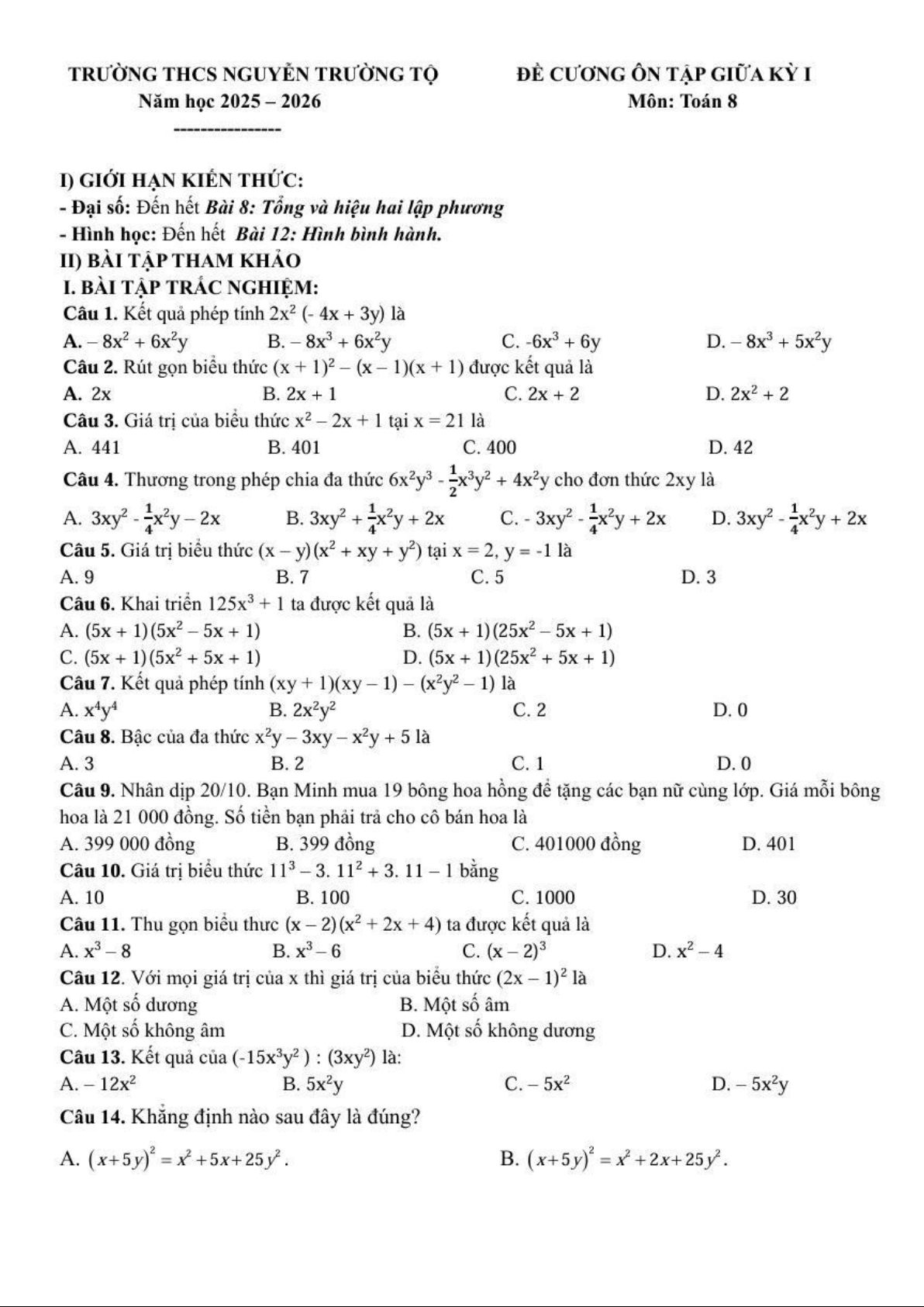 Xin giới thiệu đến quý thầy, cô giáo và các em học sinh đề cương ôn tập giữa học kỳ 1 môn Toán 8 năm học 2025 – 2026 trường THCS Nguyễn Trường Tộ, thành phố Hà Nội.
