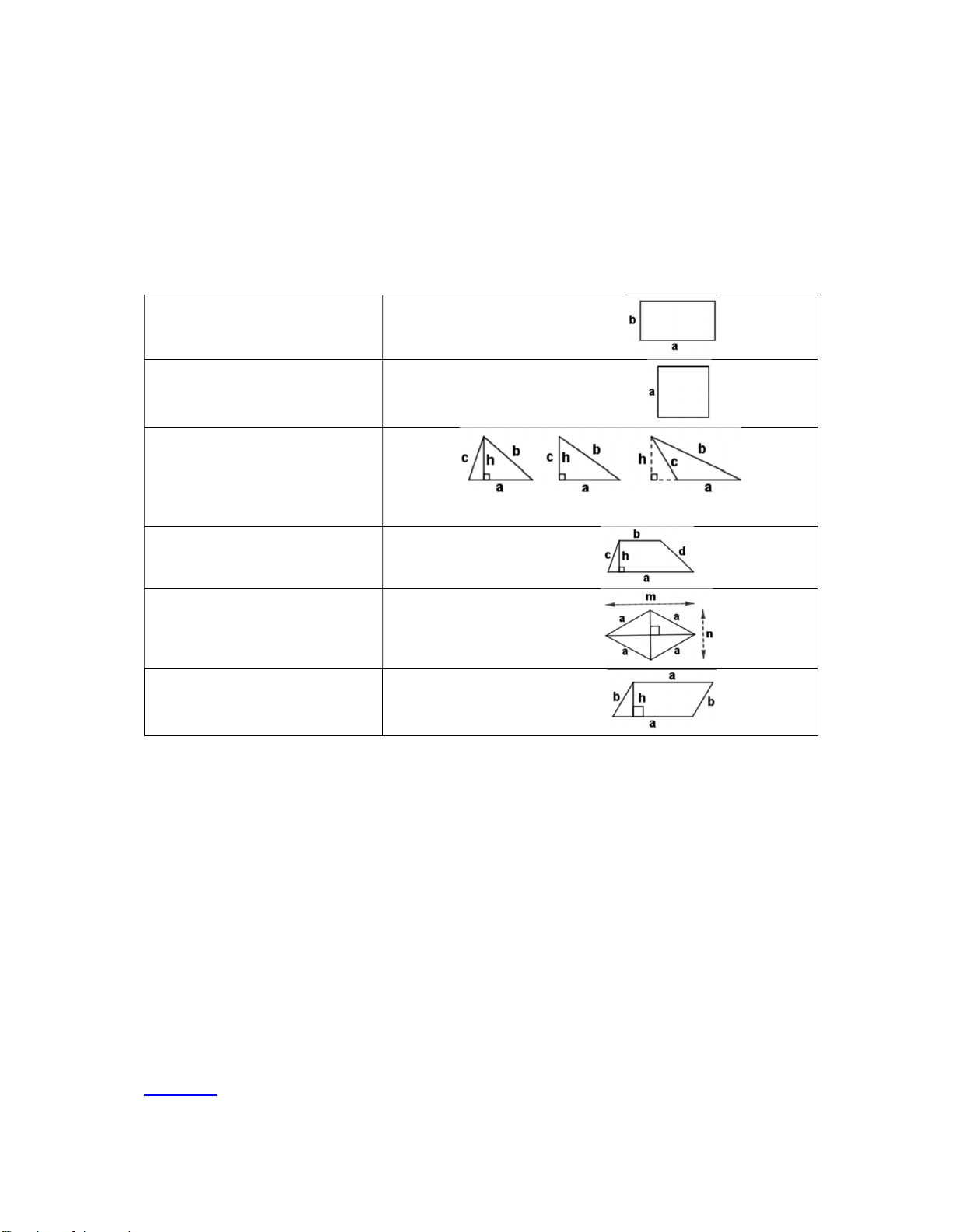 P = a + b + c S = (a . h) : 2 P = a + b + c + d Hình thang S = (a + b) . h : 2 P = a . 4 Hình thoi S = (m . n) : 2 P = 2. (a + b) Hình bình hành S = a . h