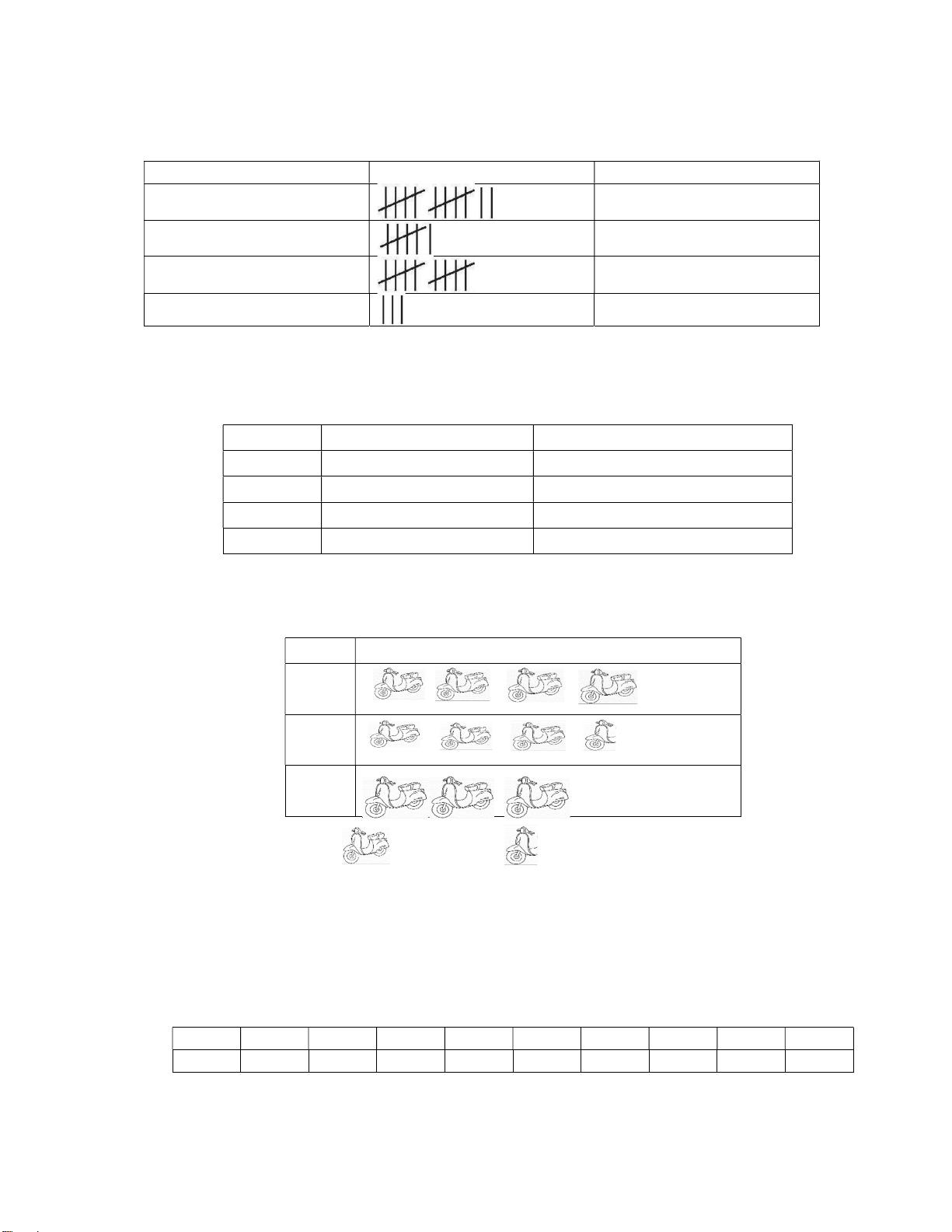 khác nhau để đi đến trường. Phương tiện Số học sinh Đi bộ 11 Xe đạp Xe máy (ba mẹ chở) Phương tiện khác (Mỗi ứng với 3 học sinh)