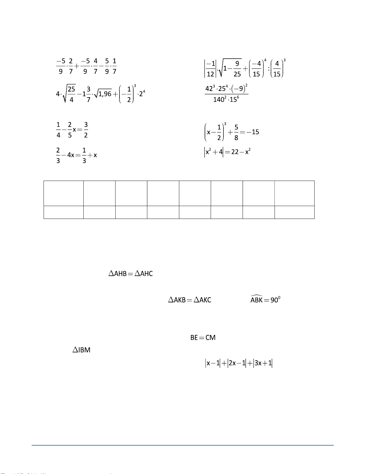 Bài 4. Tính giá trị của biểu thức sau: 2 5 4 16 a) A .0,16 : 2 0240 4 81 9 7 6 b) 5 3 17 17 B 0,5 : 0,5 : 50% 1 2 2 c) 12 5 12 1 1 C . . .12 . 17 7 17 7 17.7 Bài 5. Tìm x, biết: a) 1 2 1,5x 2 x 1,5 b) 6 9 3 4 8 5 x 8 x 2 3 x 3 3 11 11 11 11 11 c) 1 2 x (x 1) 0 1 1 3 d) x 2 4 x 3 5 2 2 4 e) x 3 5 x 1 2x 3 f) ( 3 x ) 4 5 3x 7 4 7 1 1 g) 5x 2x 2 2x 0 h) 1 4x 3 2x 1 3 x 2 2 3