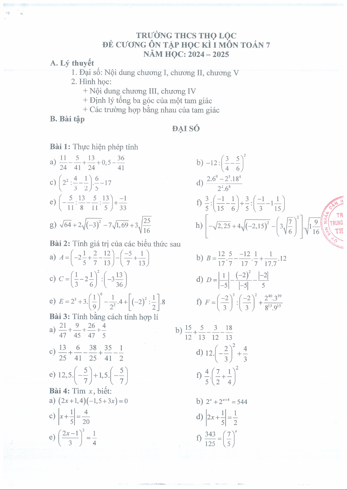 Giới thiệu đến quý thầy, cô giáo và các em học sinh lớp 7 đề cương ôn tập cuối học kì 1 môn Toán 7 năm học 2024 – 2025 trường THCS Thọ Lộc, huyện Phúc Thọ, thành phố Hà Nội.