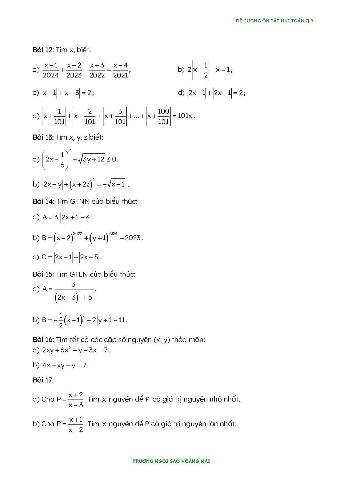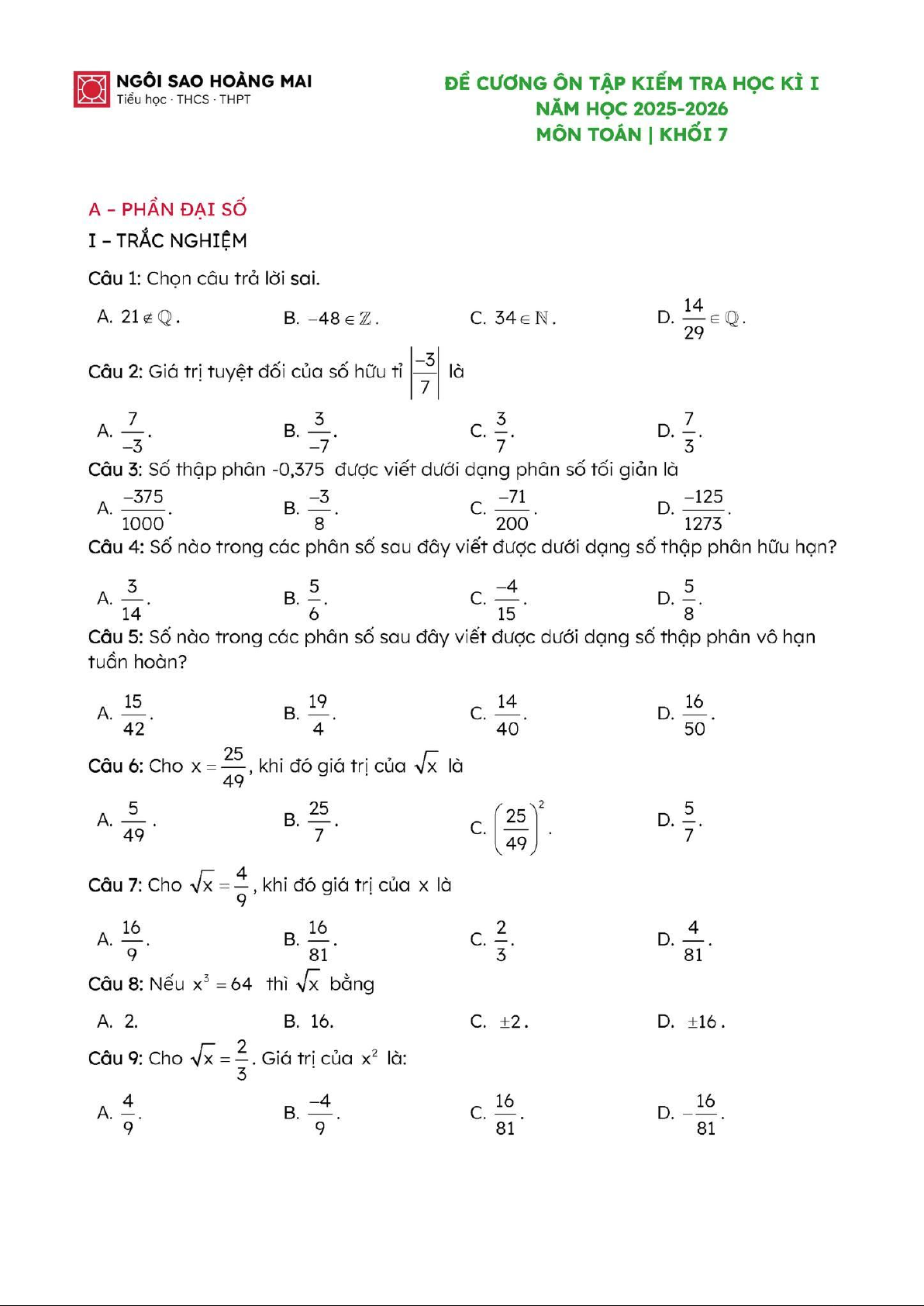 Xin giới thiệu đến quý thầy, cô giáo và các em học sinh đề cương ôn tập kiểm tra cuối học kì 1 môn Toán 7 năm học 2025 – 2026 trường Tiểu học – THCS – THPT Ngôi Sao Hoàng Mai, thành phố Hà Nội.
