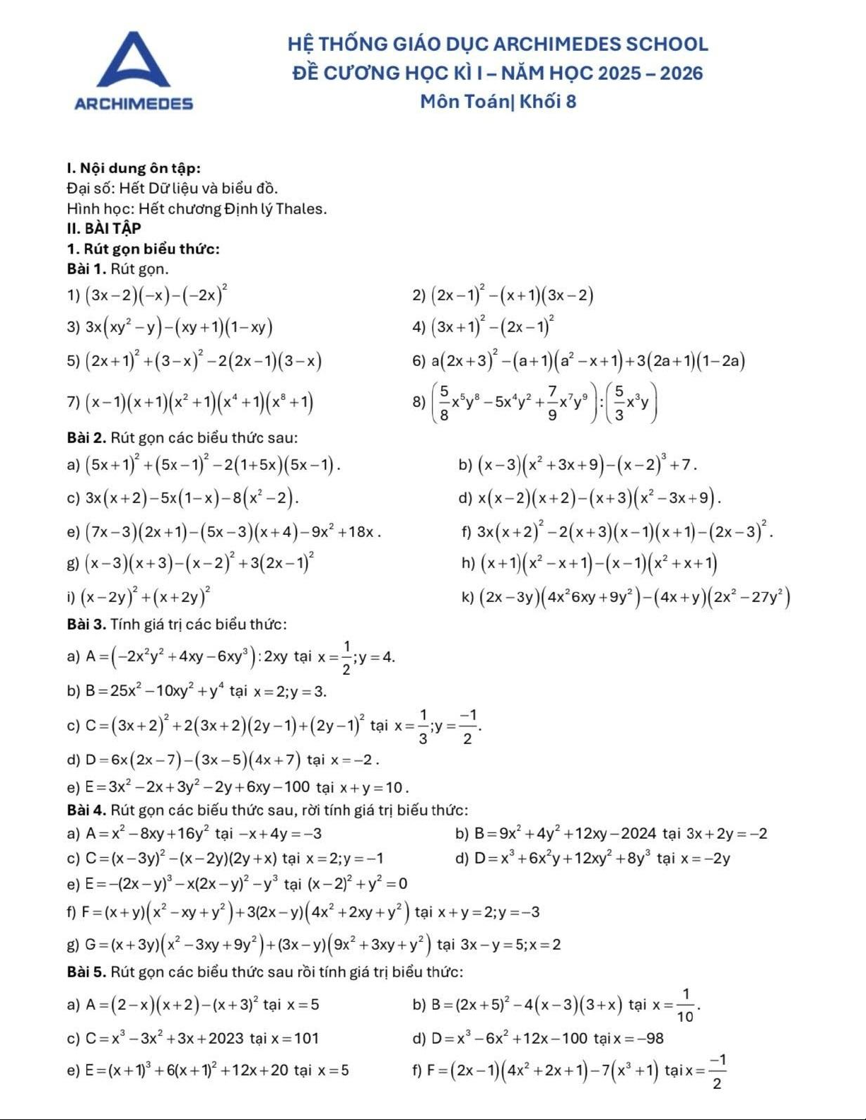 Xin giới thiệu đến quý thầy, cô giáo và các em học sinh đề cương ôn tập cuối học kì 1 môn Toán 8 năm học 2025 – 2026 hệ thống giáo dục Archimedes School, thành phố Hà Nội.