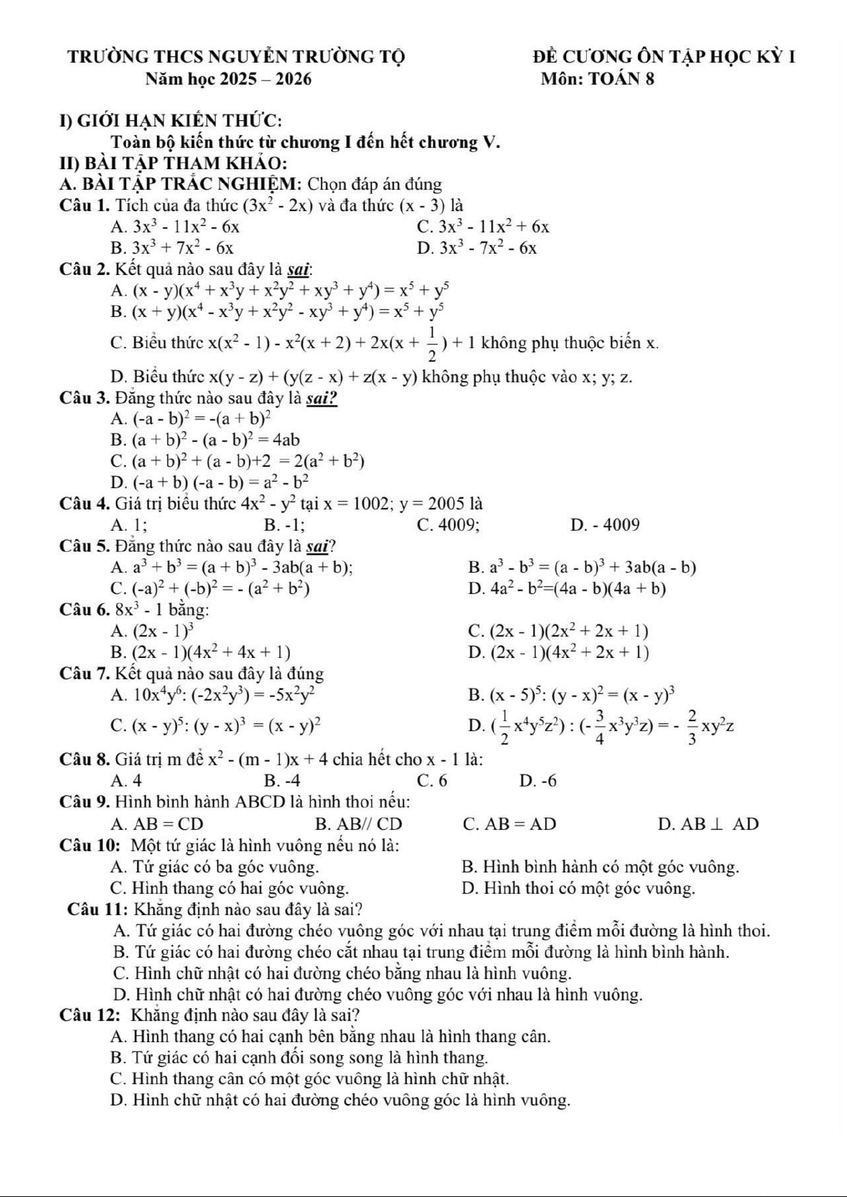 Xin giới thiệu đến quý thầy, cô giáo và các em học sinh đề cương ôn tập cuối học kỳ 1 môn Toán 8 năm học 2025 – 2026 trường THCS Nguyễn Trường Tộ, thành phố Hà Nội.