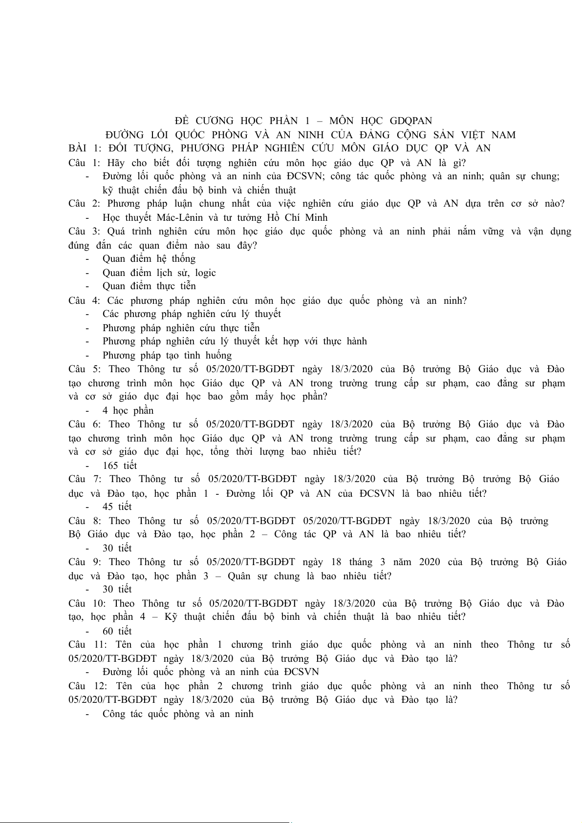 Câu 17: Chương trình giáo dục QP và AN theo Thông tư số 05/2020/TT- BGDĐT ngày 18/3/2020