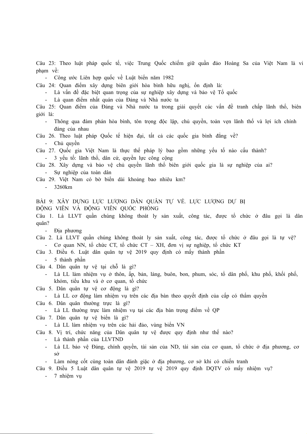 Câu 10 + Câu 11: Một trong những vị trí vai trò của dân quân tự vệ là: - Là thành phần của LLVTND -