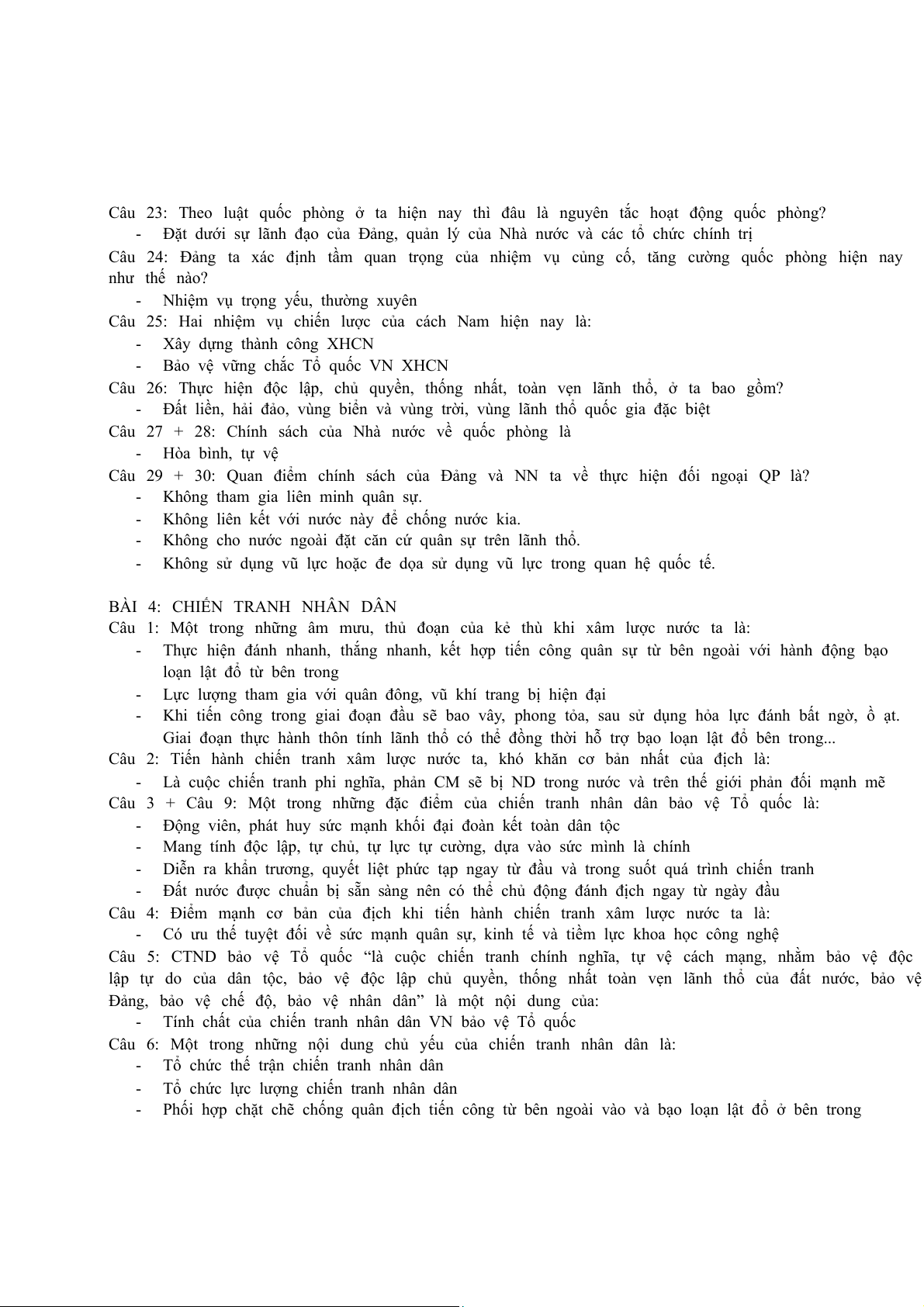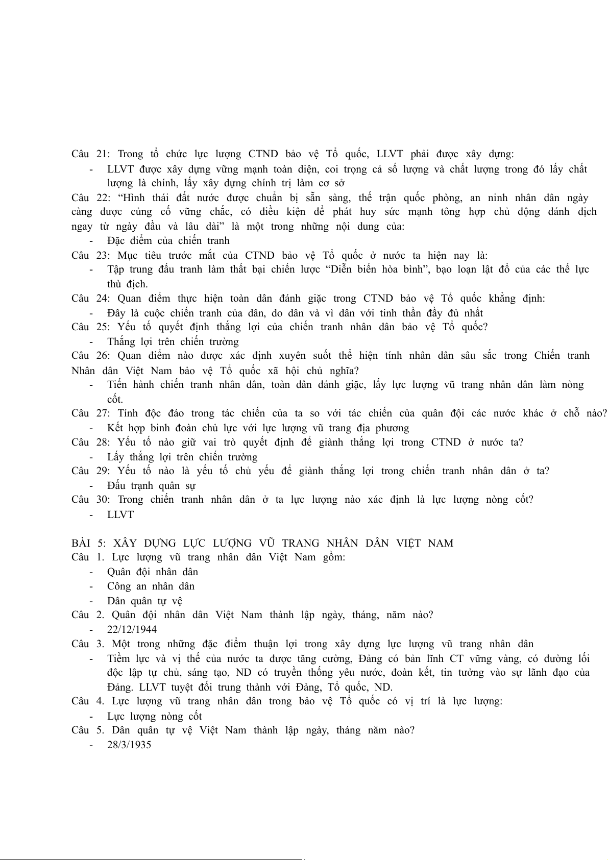 Câu 29. Xây dựng dân quân tự vệ vững mạnh, rộng khắp, có số lượng phù hợp, Đảng ta xác định