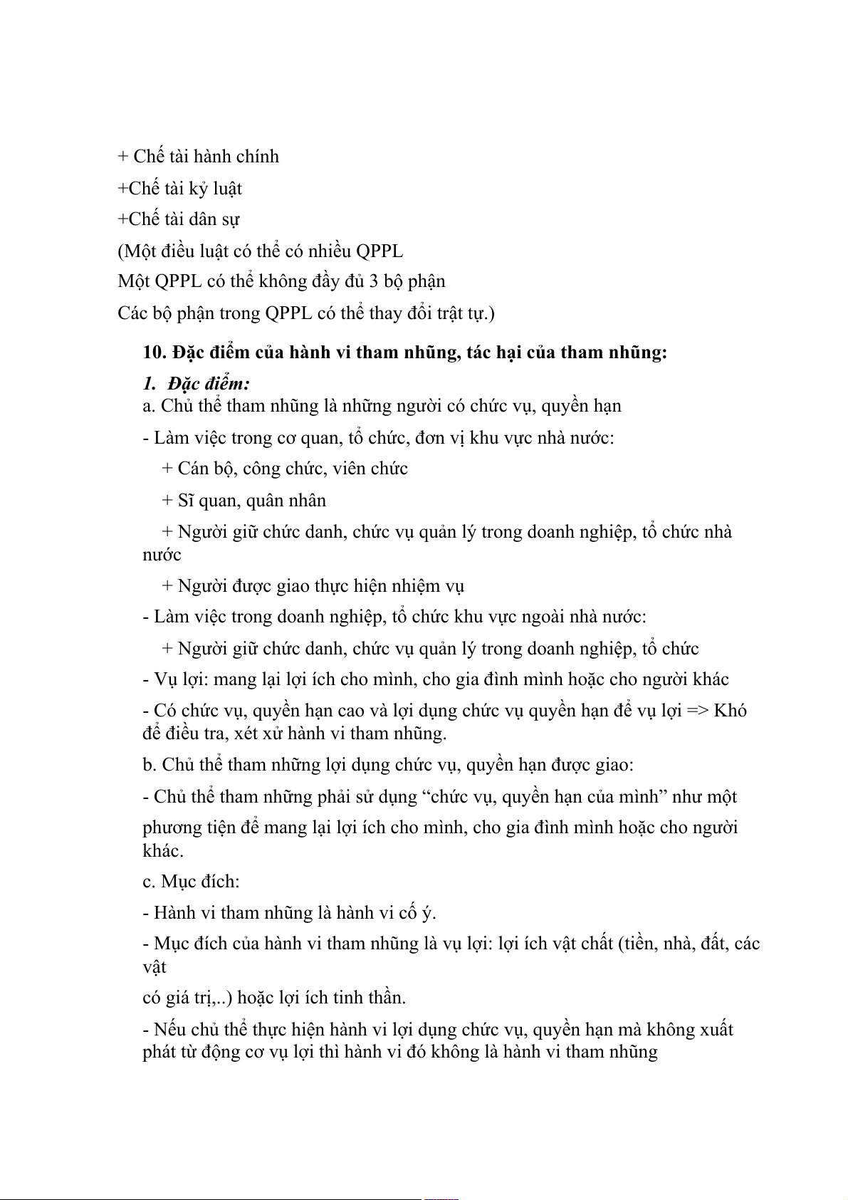 10. Đặc điểm của hành vi tham nhũng, tác hại của tham nhũng: 1. Đặc điểm: