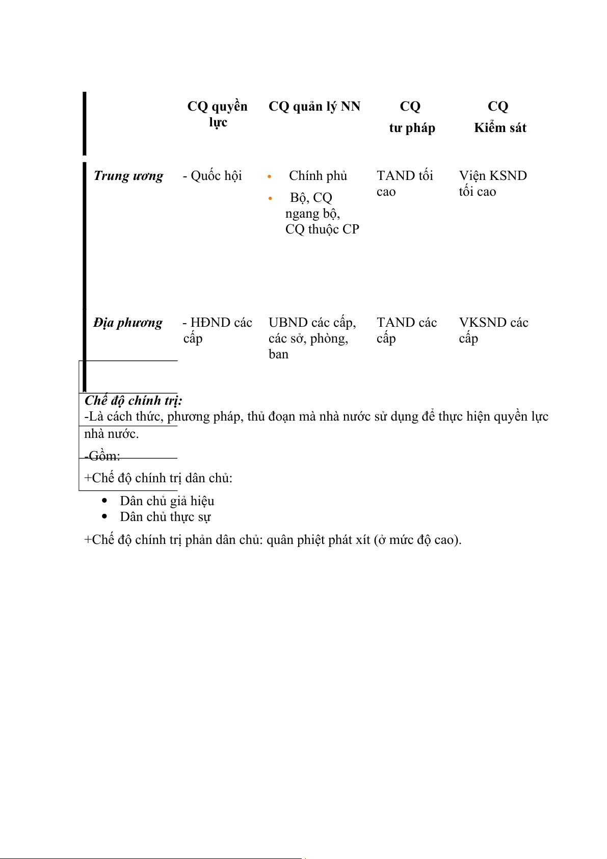 nước và xác lập mối quan hệ cơ bản của các cơ quan đó. -Gồm: +Chính thể quân chủ: CQ quyền CQ quản lý NN CQ CQ lực tư pháp Kiểm sát Trung ương - Quốc hội Chính phủ TAND tối Viện KSND cao tối cao Bộ, CQ ngang bộ, CQ thuộc CP Địa phương - HĐND các UBND các cấp, TAND các VKSND các cấp các sở, phòng, cấp cấp ban