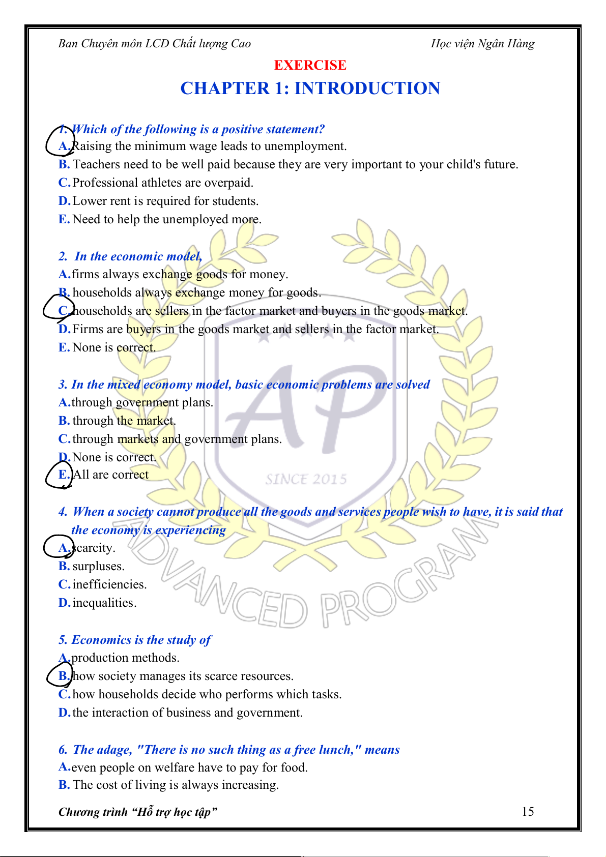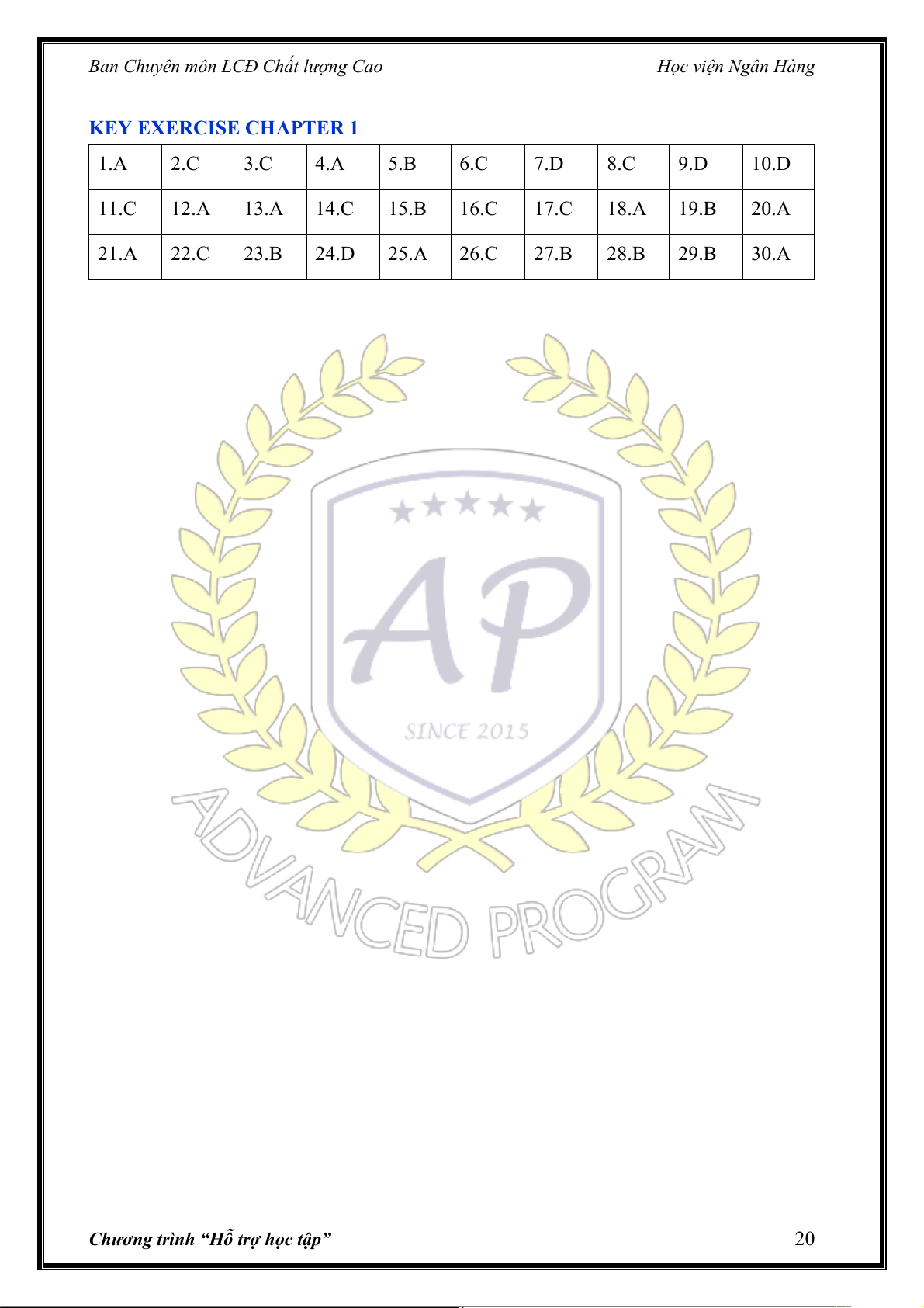 Học viện Ngân Hàng KEY EXERCISE CHAPTER 1 1.A 2.C 3.C 4.A 5.B 6.C 7.D 8.C 9.D 10.D 11.C 12.A 13.A 14.C 15.B 16.C 17.C 18.A 19.B 20.A 21.A 22.C 23.B 24.D 25.A 26.C 27.B 28.B 29.B 30.A