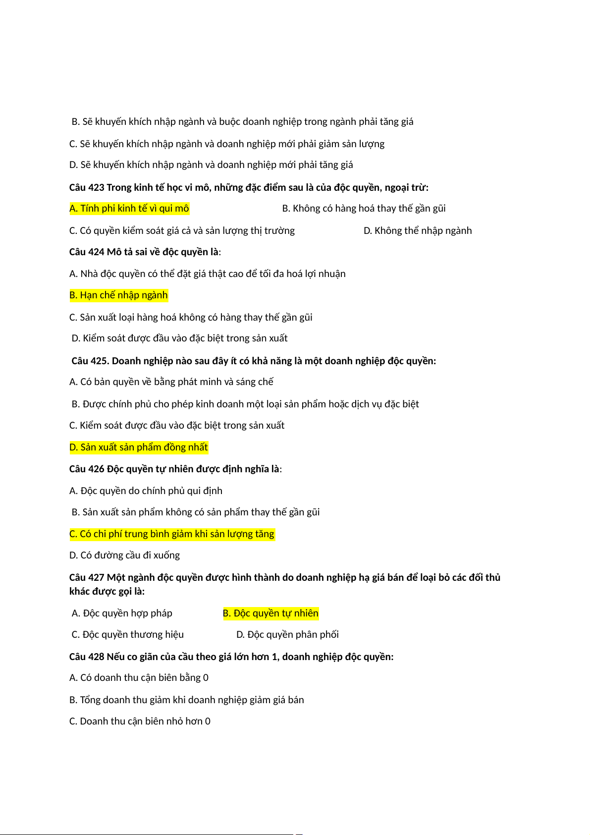 Câu 427 Một ngành độc quyền được hình thành do doanh nghiệp hạ giá bán để loại bỏ các đối thủ khác được gọi là: