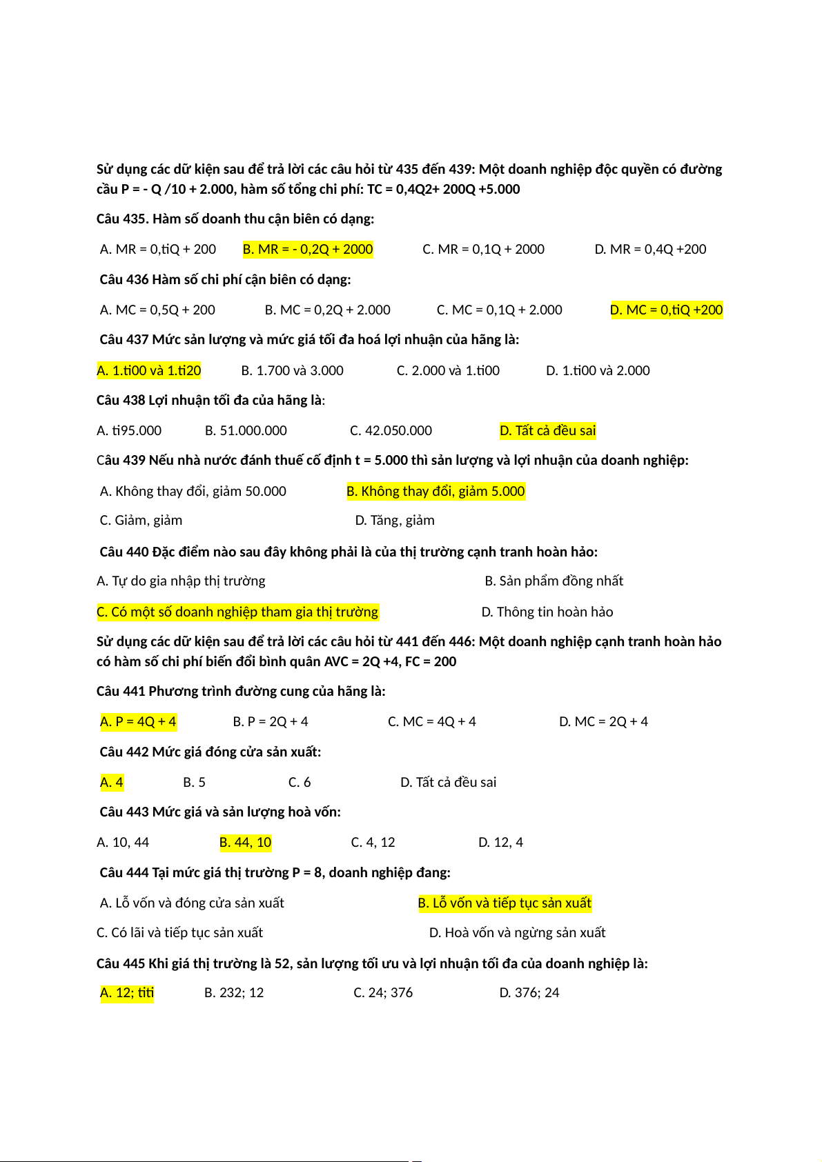 Câu 438 Lợi nhuận tối đa của hãng là: