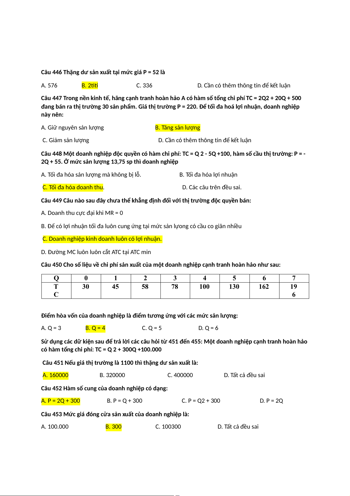 Câu 443 Mức giá và sản lượng hoà vốn: