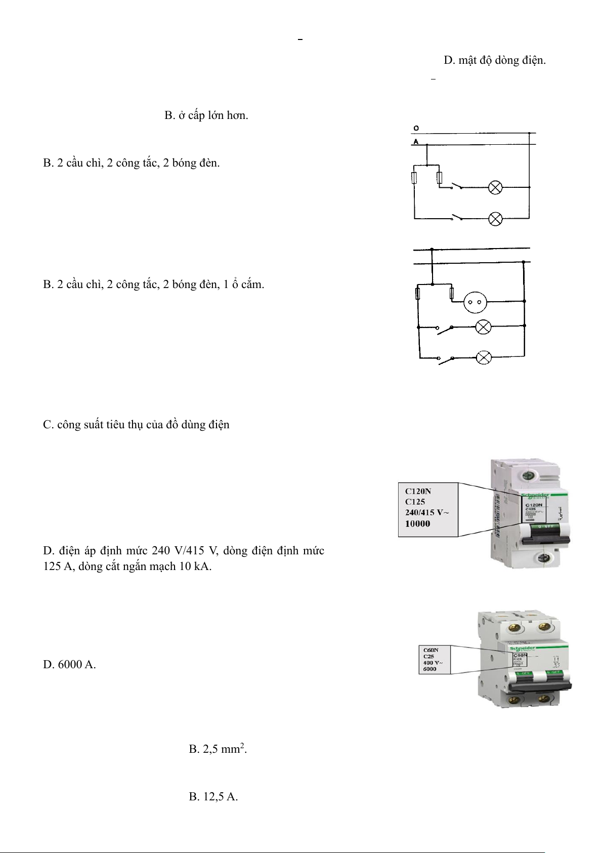 Câu 16. Để đảm bảo an toàn, sau khi tính tiết diện dây dẫn theo công thức S = 𝐼 thì nên chọn dây dẫn điện 𝐽 có tiết diện A. ở cấp nhỏ hơn. B. ở cấp lớn hơn.