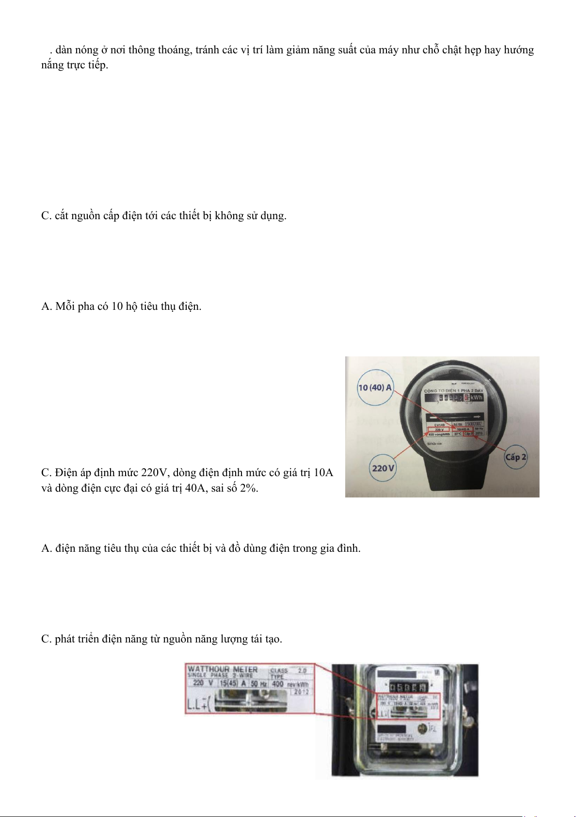 Câu 10. Thiết bị điện có chức năng đo điện năng tiêu thụ của các thiết bị và đồ dùng điện trong gia đình là A. công tắc điện. B. aptomat. C. công tơ điện. D. cầu dao điện.