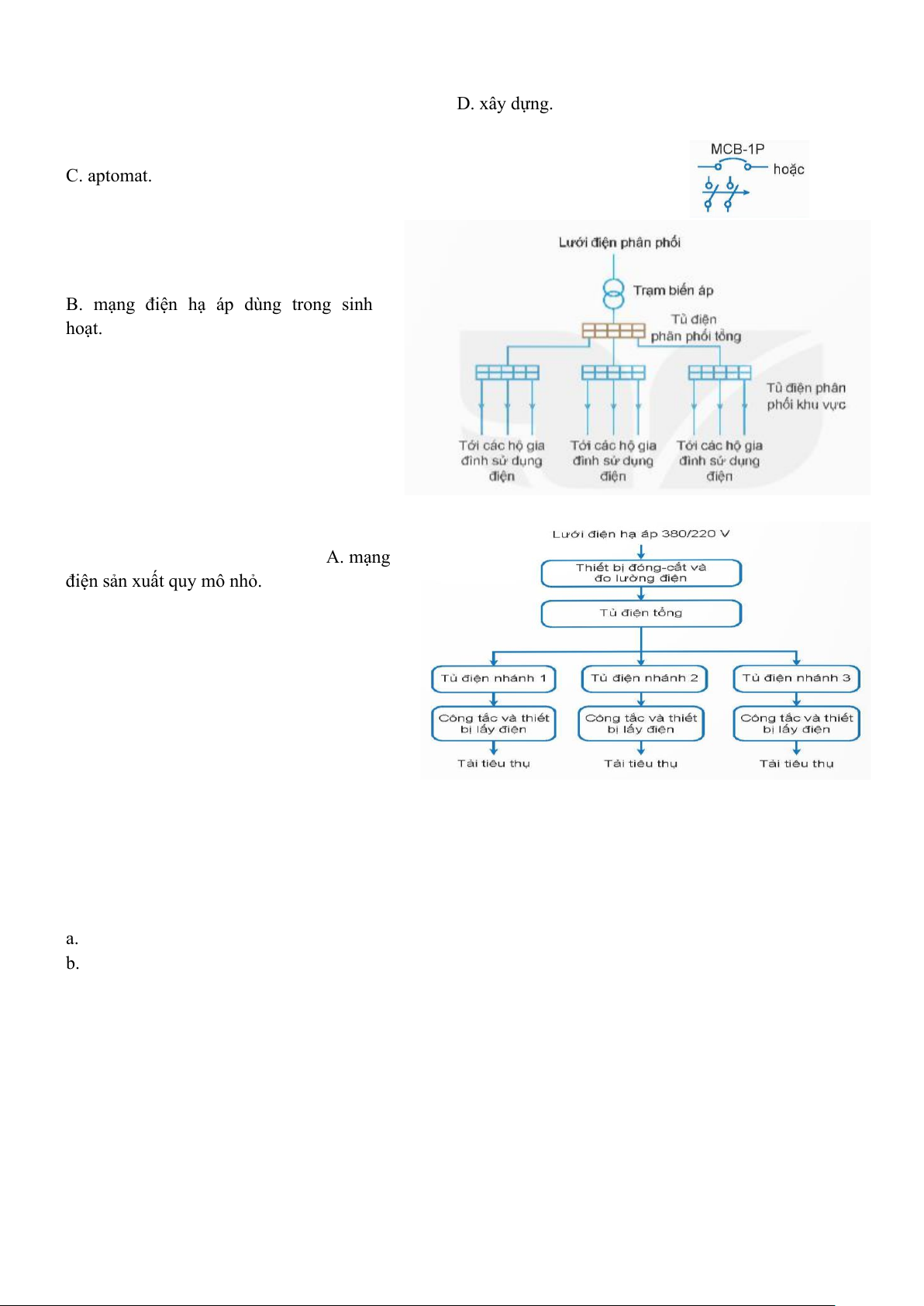 Câu 11. Thiết bị điện có chức năng đóng - cắt mạch điện và tự động đóng cắt mạch điện khi có sự cố về điện là A. công tắc điện. B. aptomat. C. công tơ điện. D. cầu dao điện.