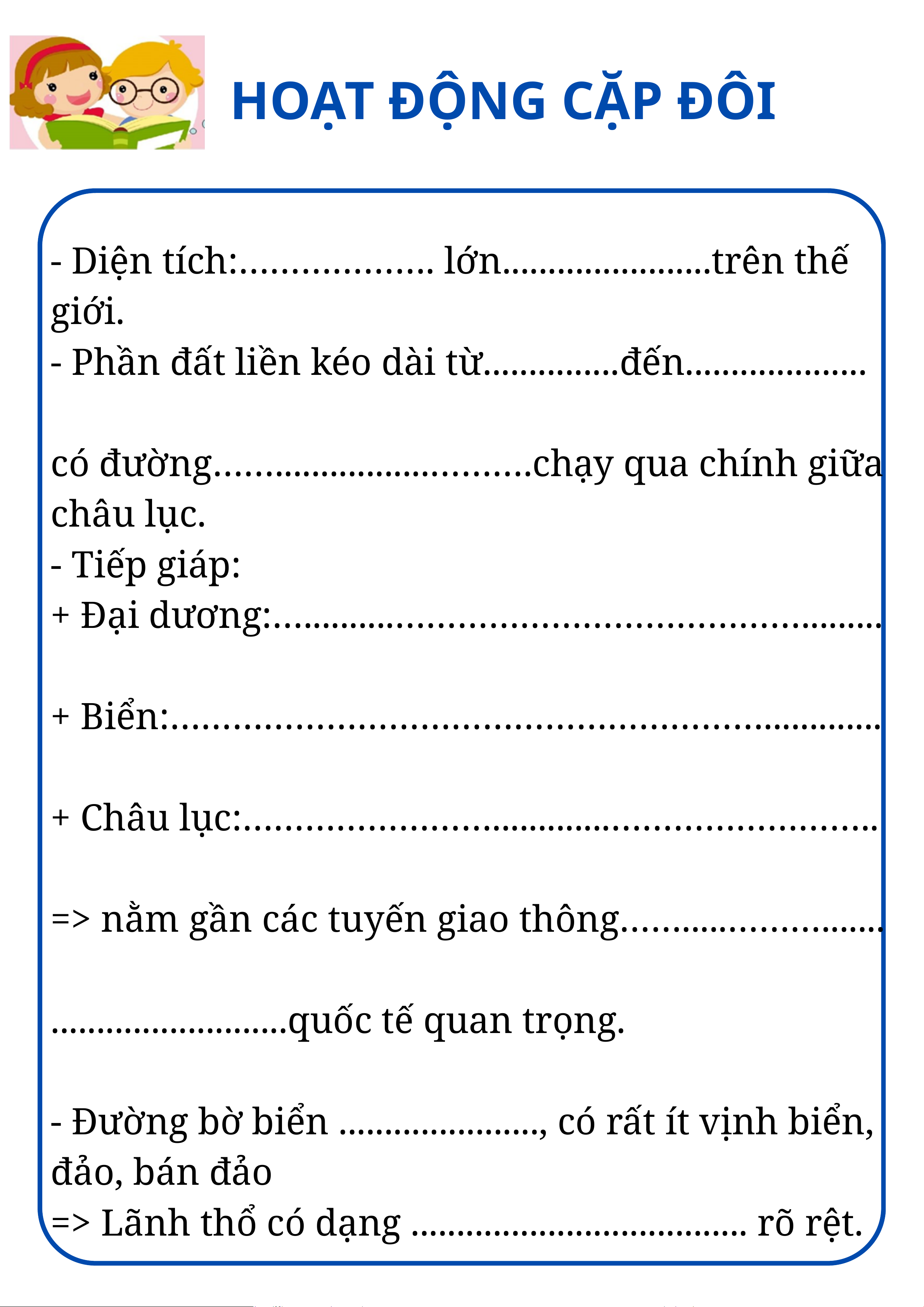 có đường……. . . . . . . . .……….chạy qua chính giữa châu lục. - Tiếp giáp: