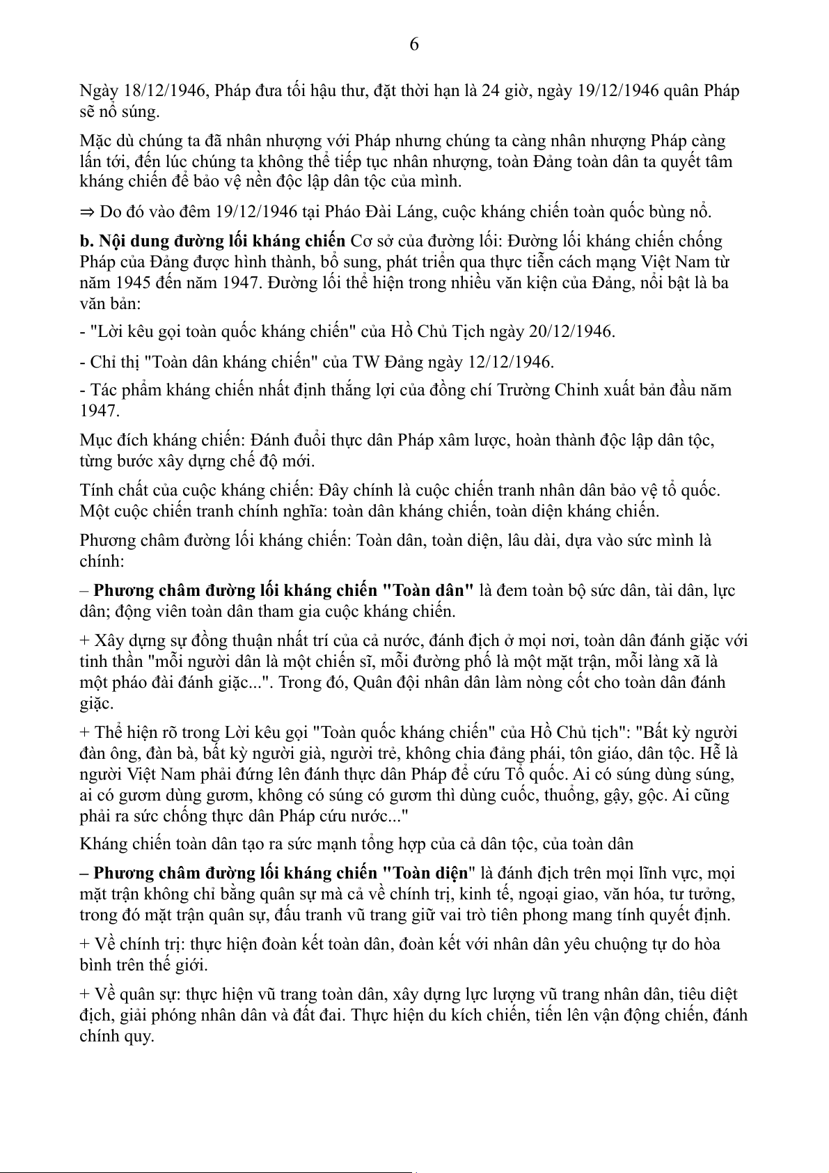– Phương châm đường lối kháng chiến "Toàn diện" là đánh địch trên mọi lĩnh vực, mọi