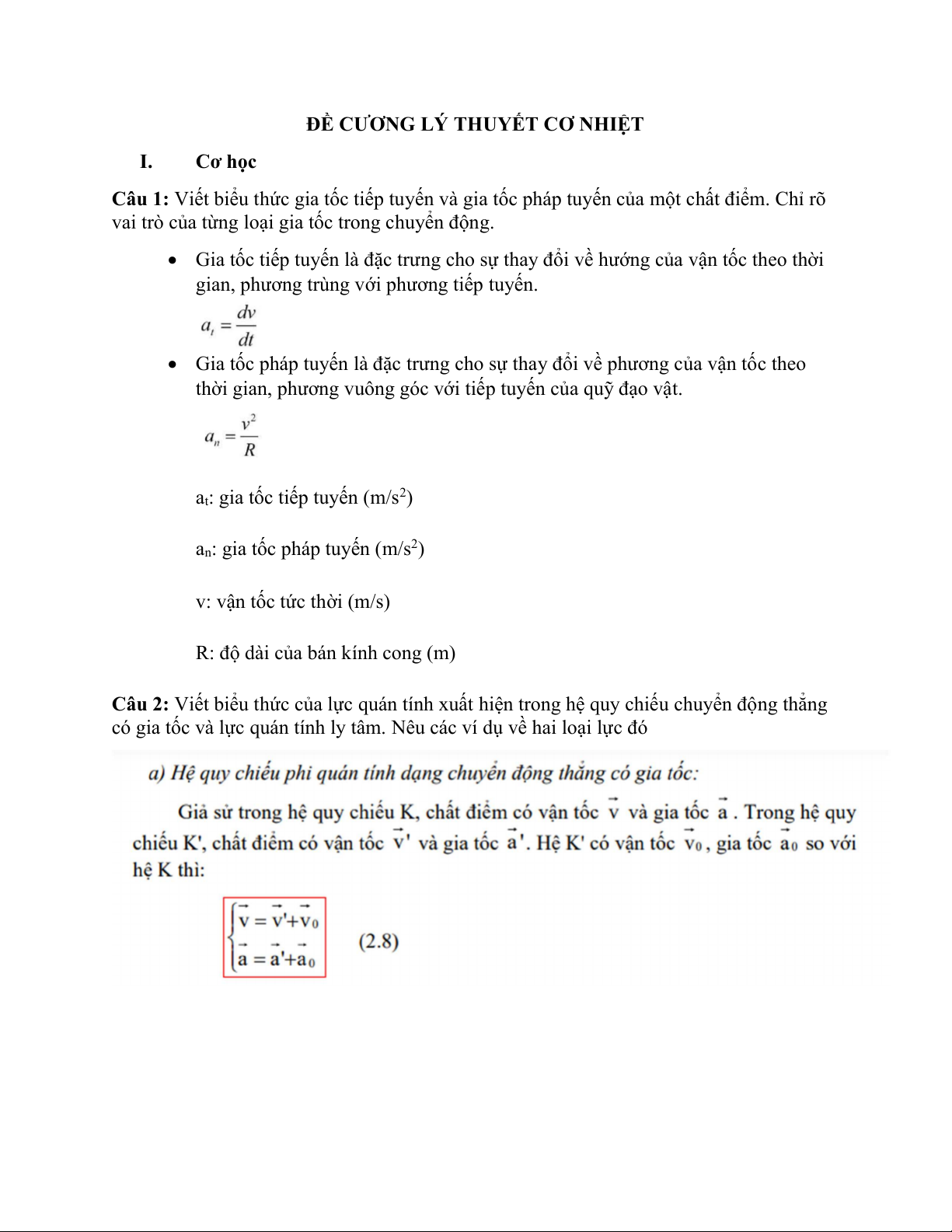 ĐỀ CƯƠNG LÝ THUYẾT CƠ NHIỆT I. Cơ học