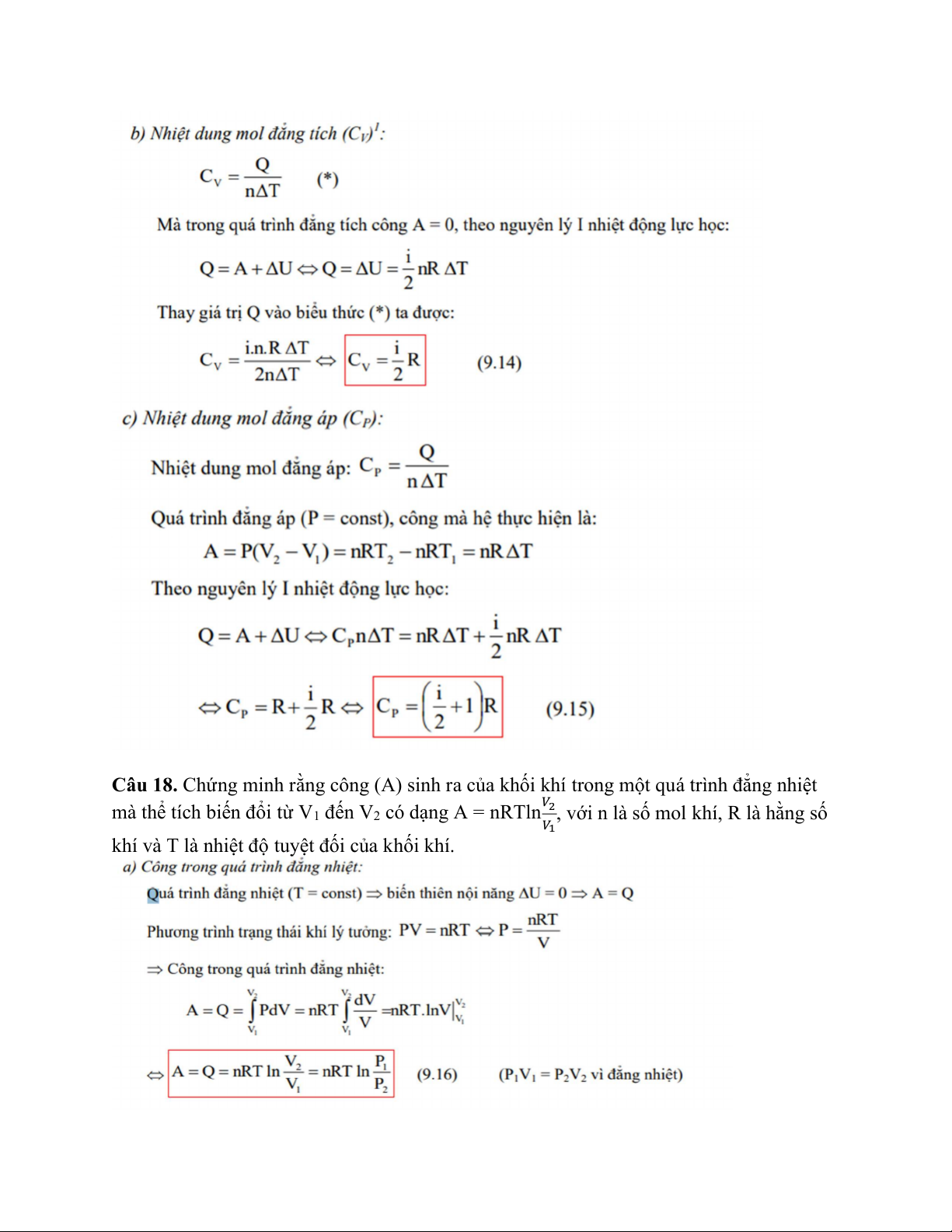 Câu 18. Chứng minh rằng công (A) sinh ra của khối khí trong một quá trình đẳng nhiệt