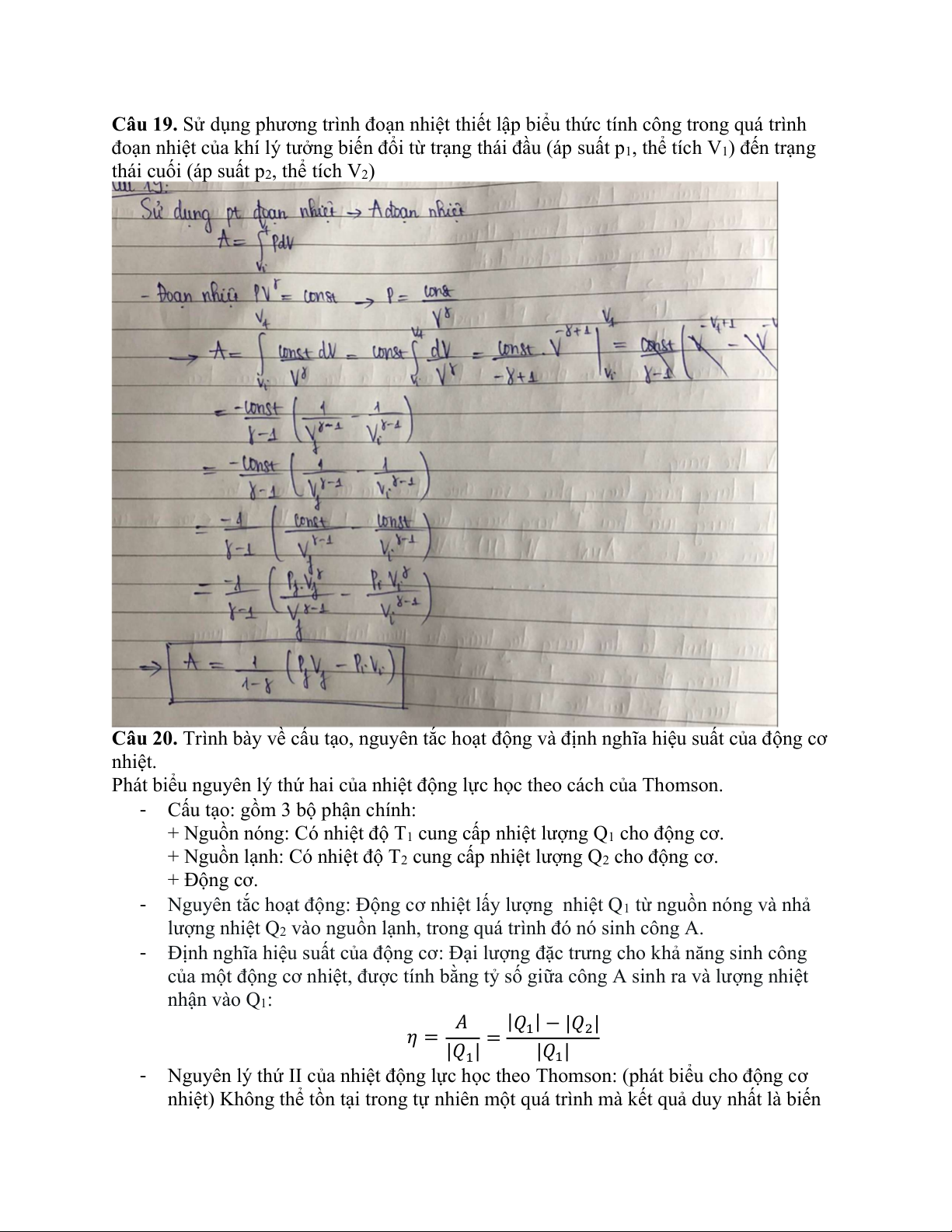 Câu 19. Sử dụng phương trình đoạn nhiệt thiết lập biểu thức tính công trong quá trình