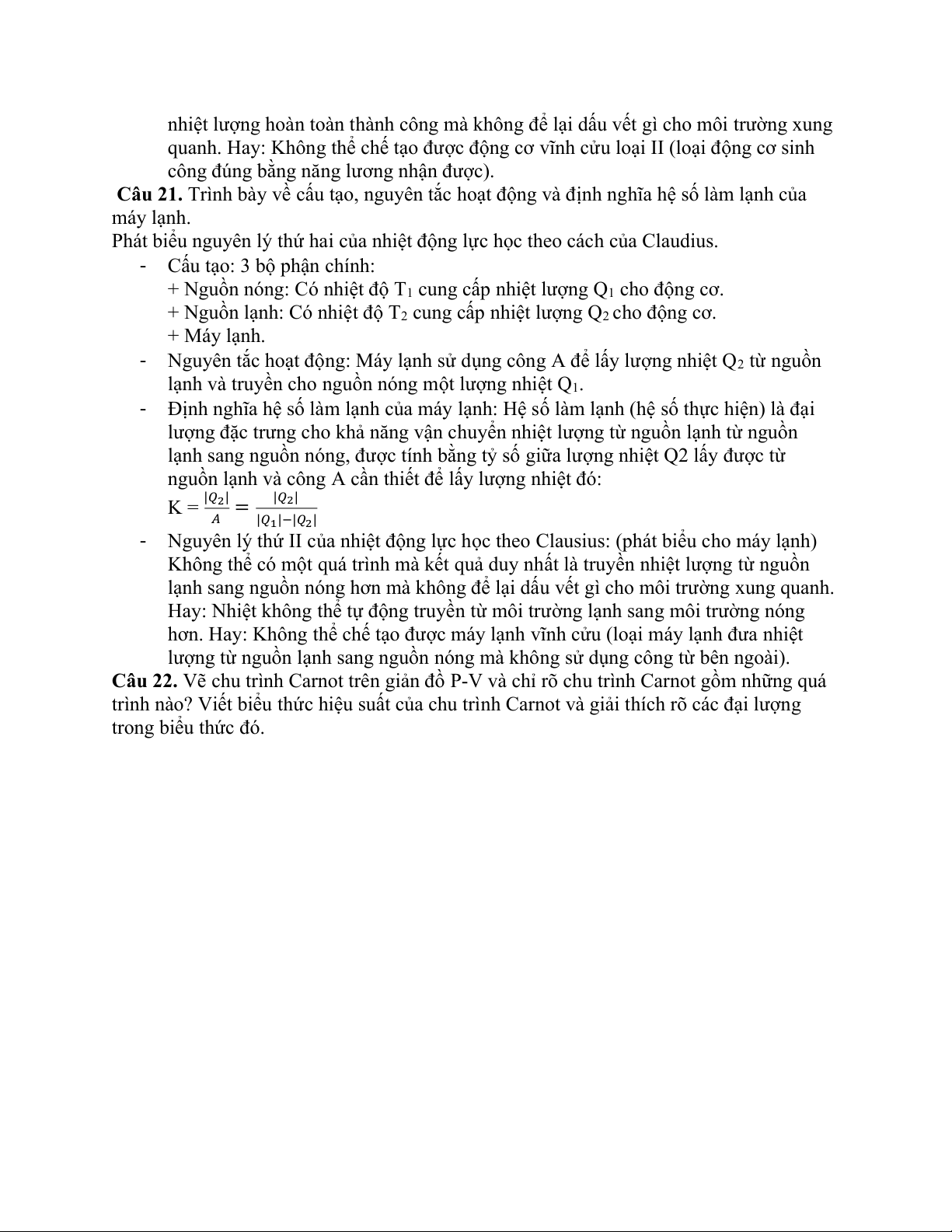 Câu 21. Trình bày về cấu tạo, nguyên tắc hoạt động và định nghĩa hệ số làm lạnh của máy lạnh.
