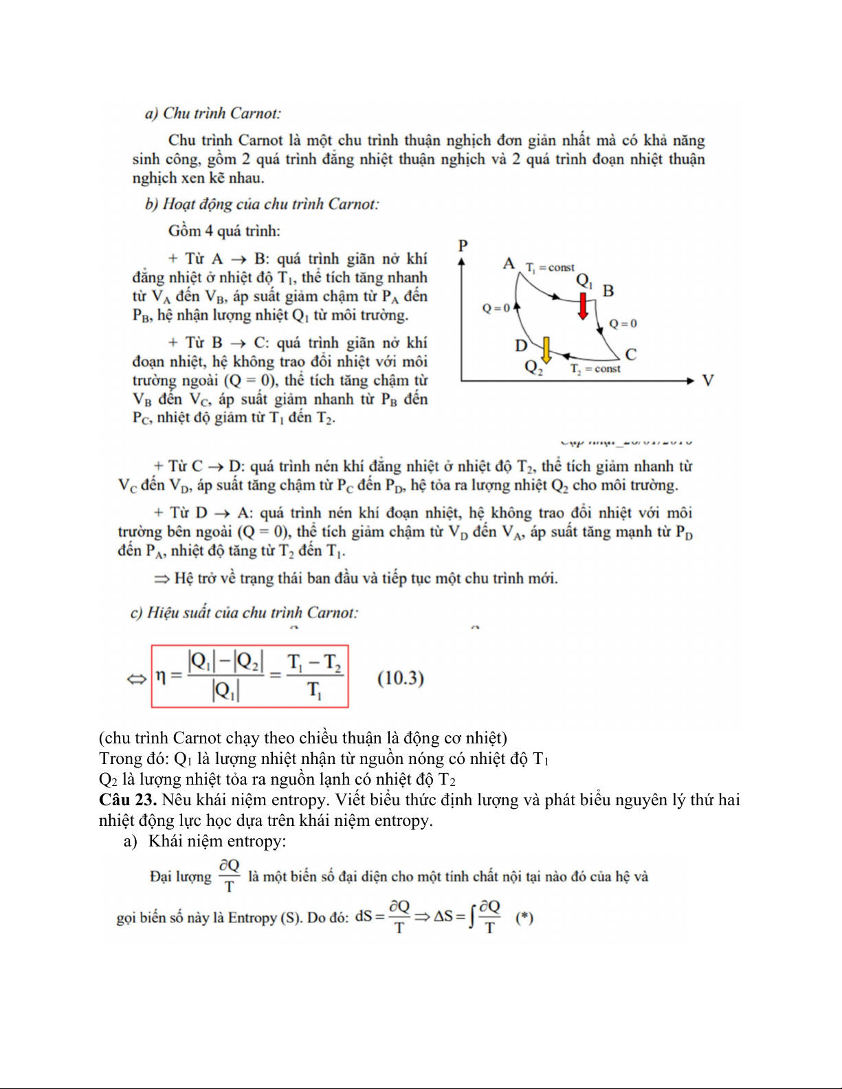 Câu 23. Nêu khái niệm entropy. Viết biểu thức định lượng và phát biểu nguyên lý thứ hai