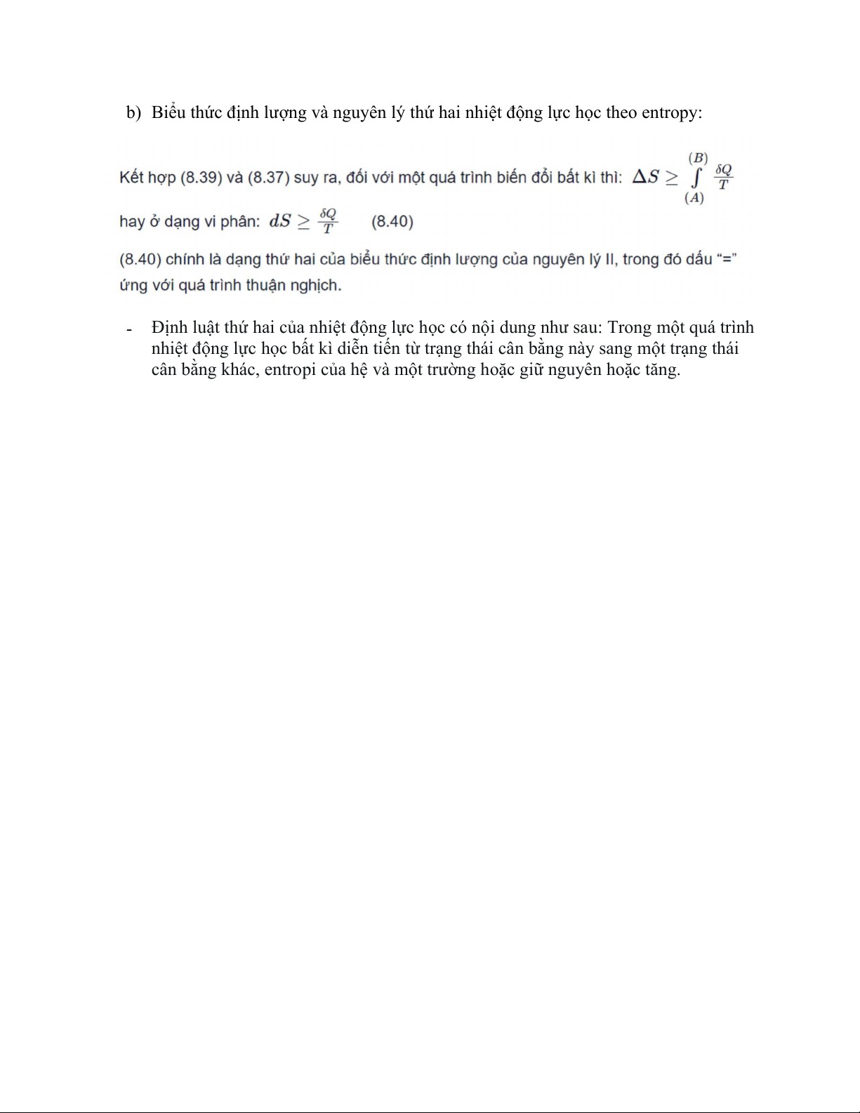 b) Biểu thức định lượng và nguyên lý thứ hai nhiệt động lực học theo entropy:
