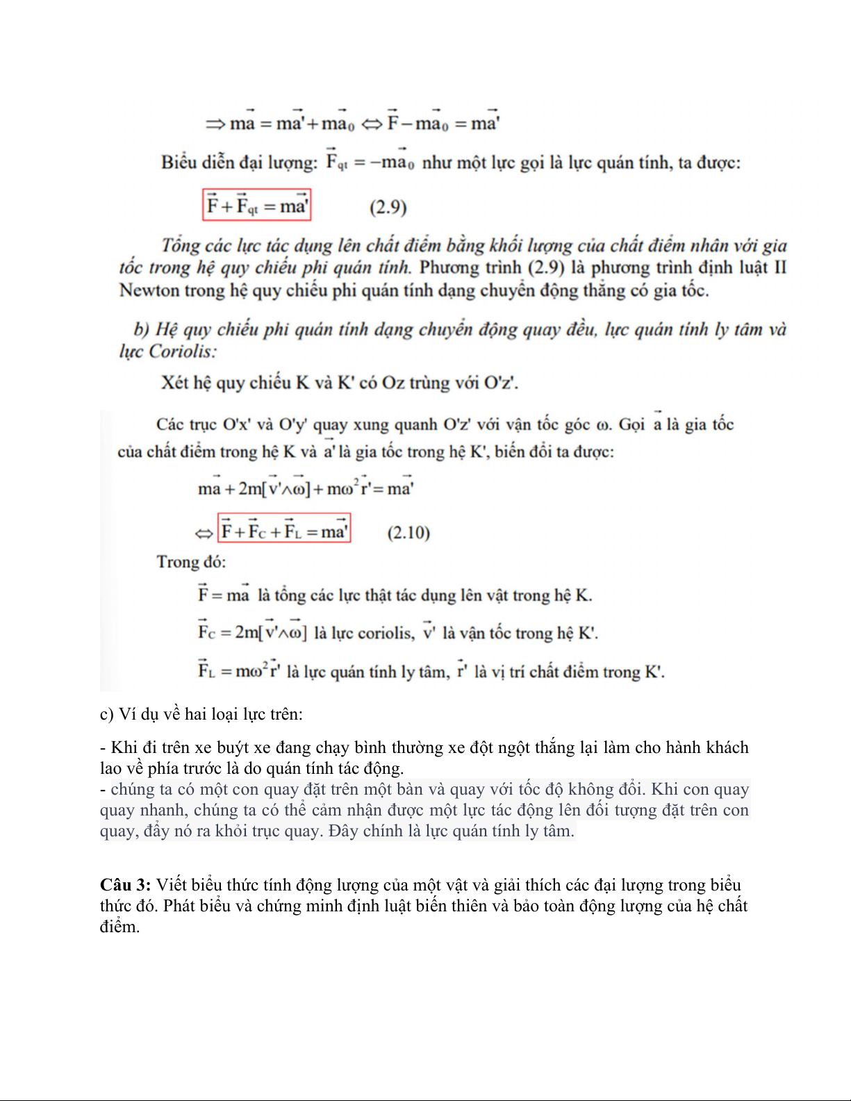 Câu 2: Viết biểu thức của lực quán tính xuất hiện trong hệ quy chiếu chuyển động thẳng