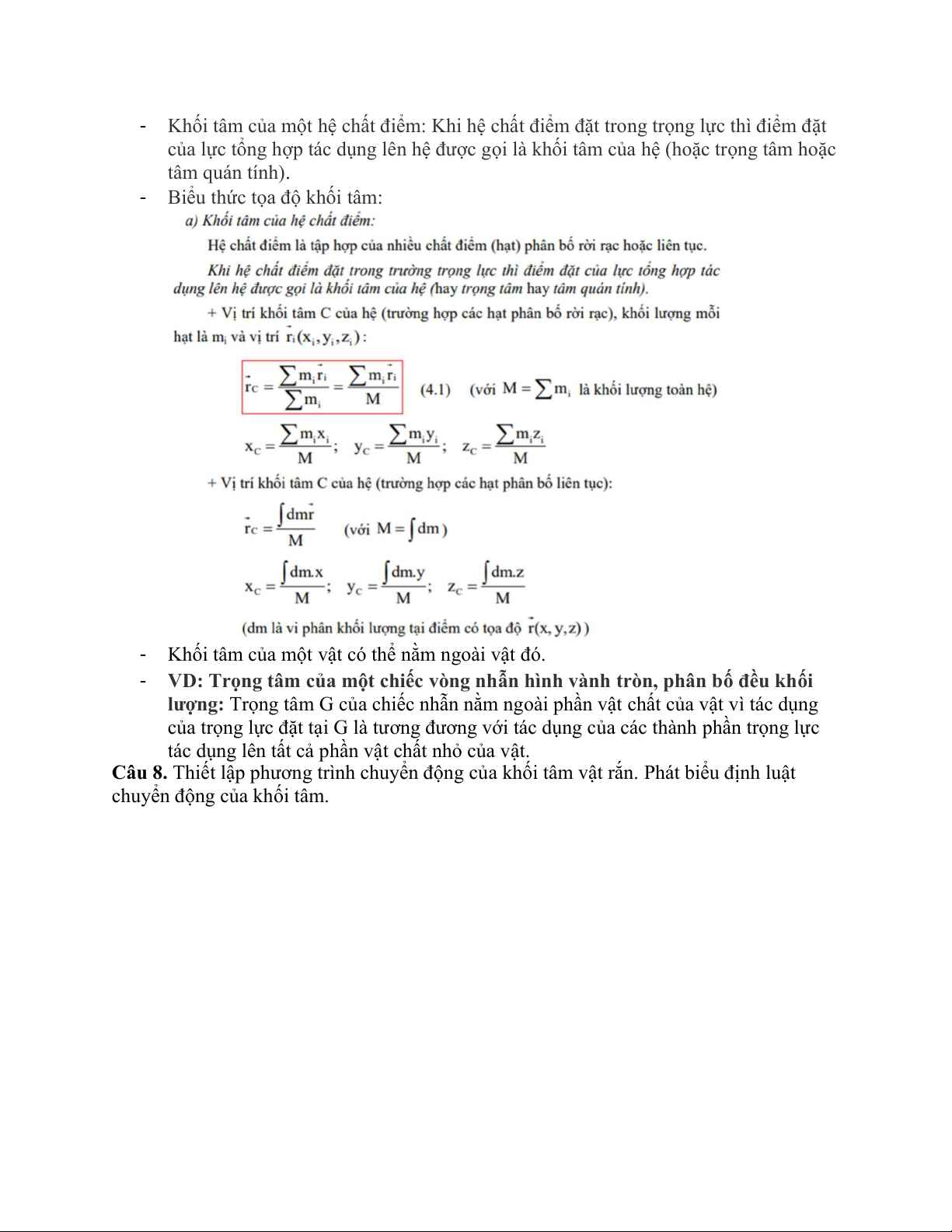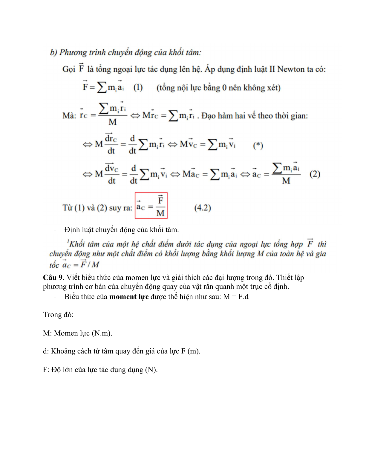 Câu 8. Thiết lập phương trình chuyển động của khối tâm vật rắn. Phát biểu định luật