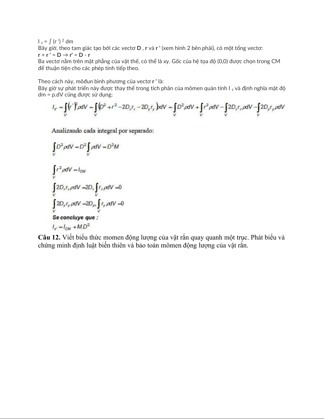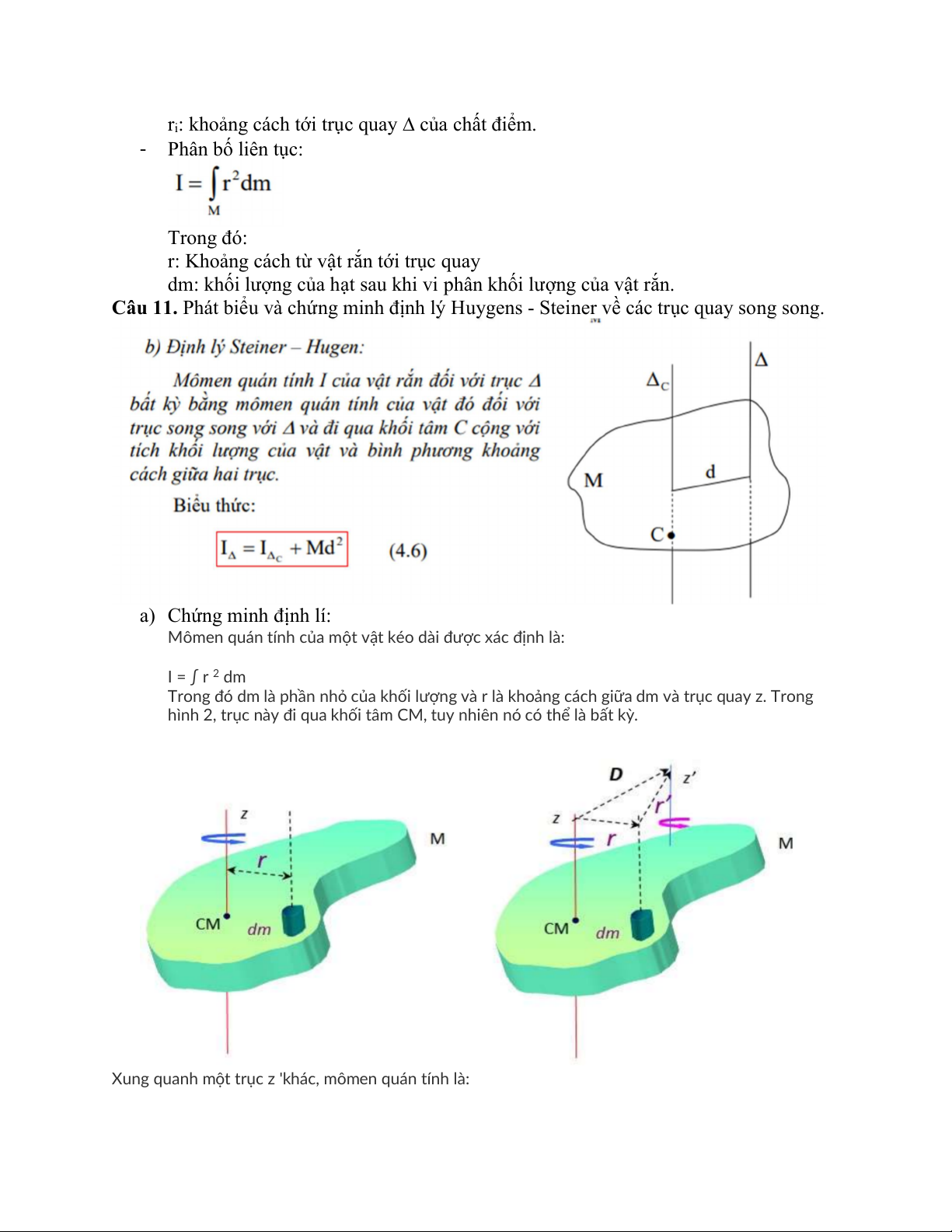 Câu 11. Phát biểu và chứng minh định lý Huygens - Steiner về các trục quay song song. a) Chứng minh định lí: