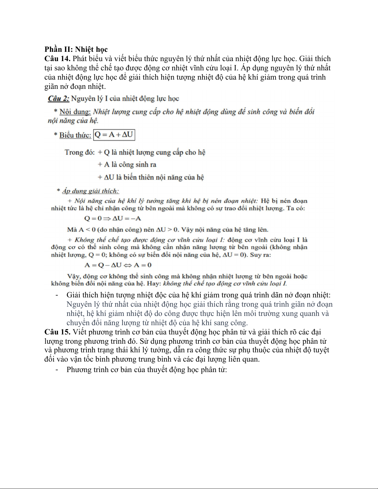 Câu 14. Phát biểu và viết biểu thức nguyên lý thứ nhất của nhiệt động lực học. Giải thích