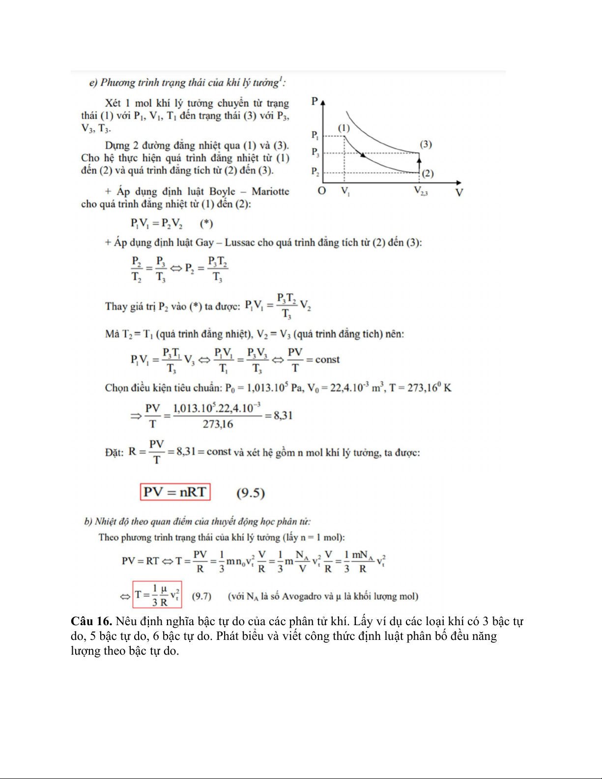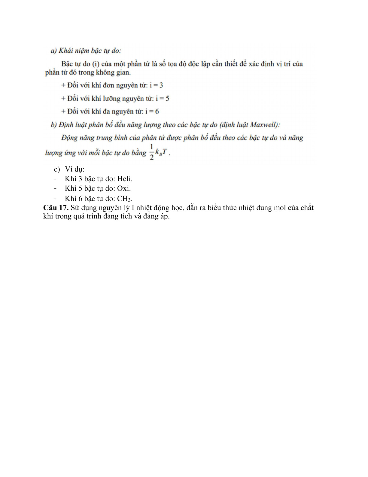 Câu 16. Nêu định nghĩa bậc tự do của các phân tử khí. Lấy ví dụ các loại khí có 3 bậc tự