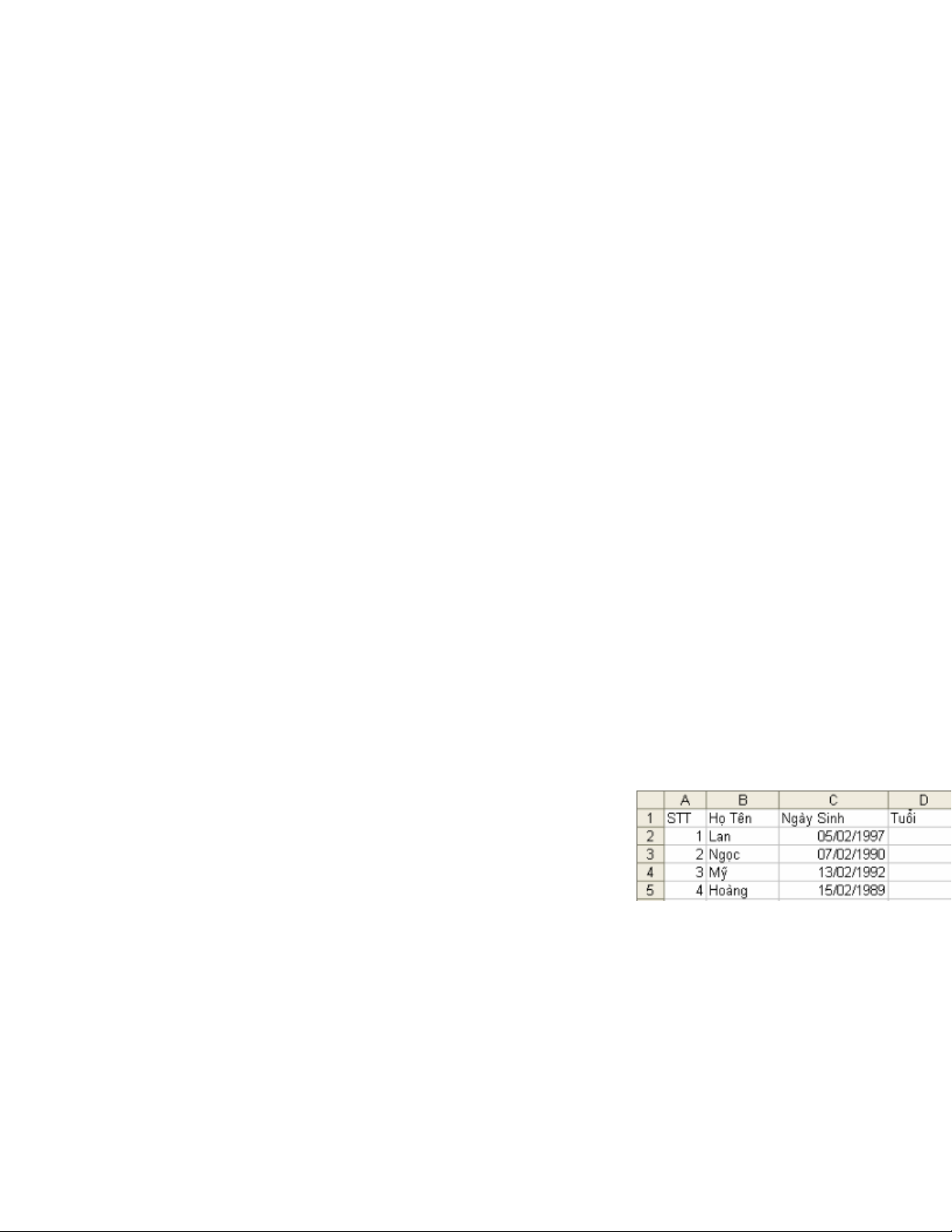 liệu vào bảng tính Excel thì: YEAR(TODAY()) D. Cả A và B đều đúng