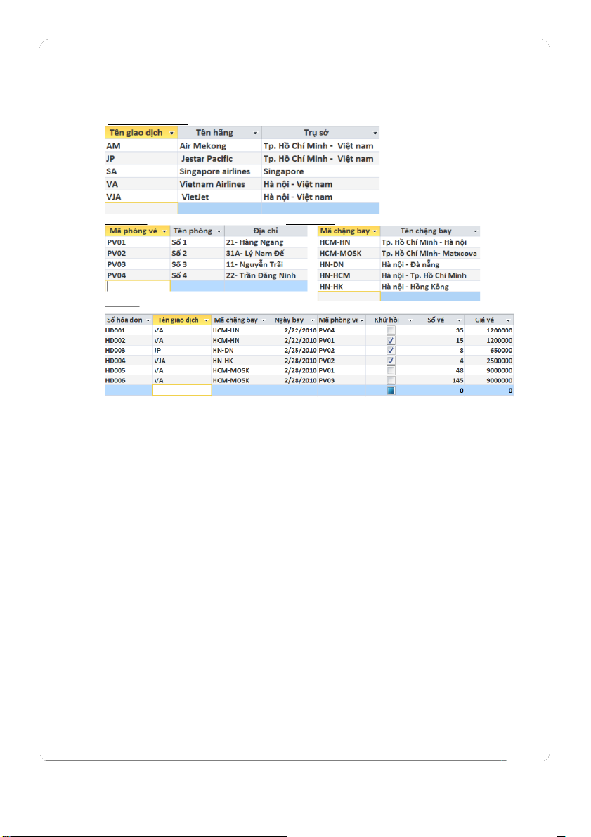 Cho CSDL gồm các bảng sau: Hãng hàng không: Phòng vé: Chặng bay: Bán vé: